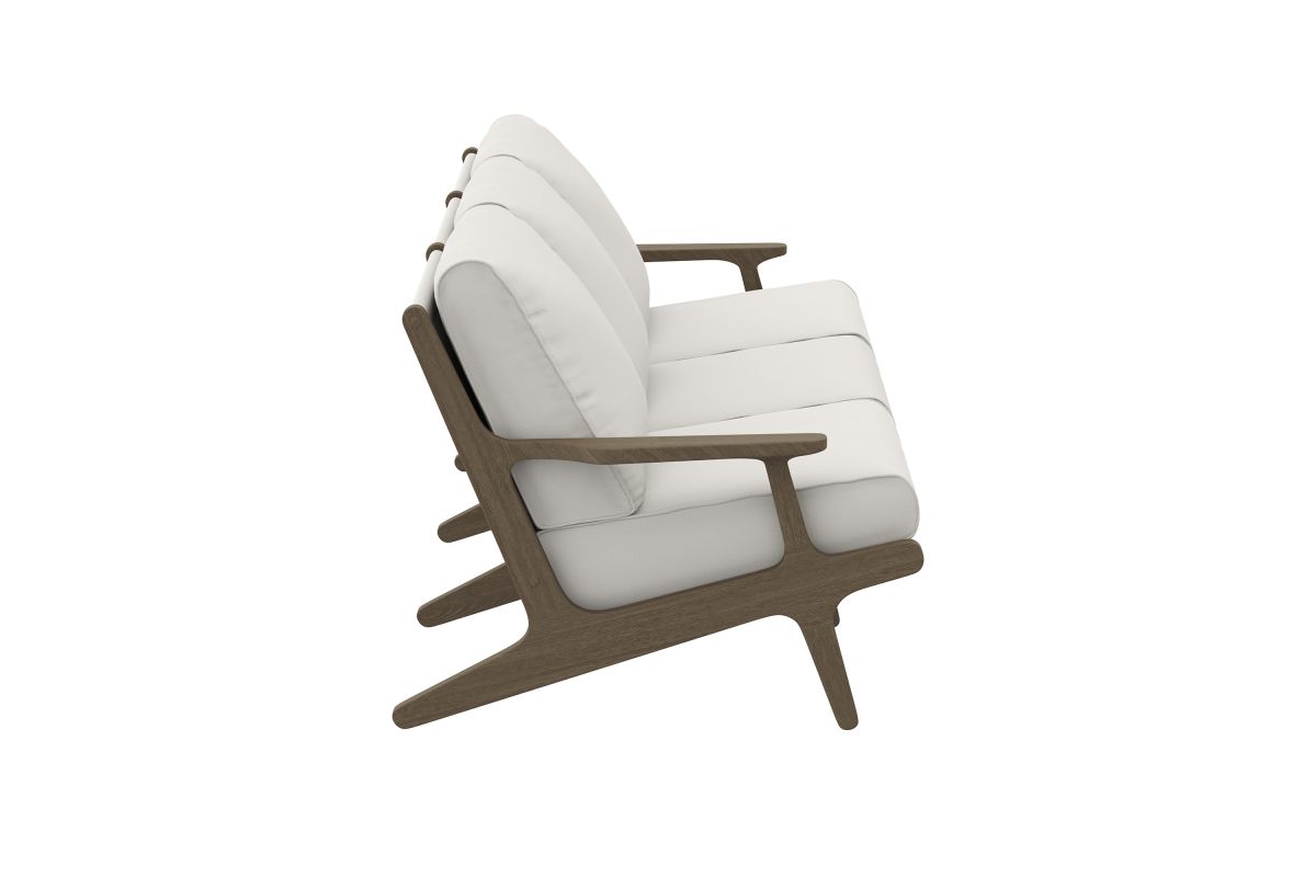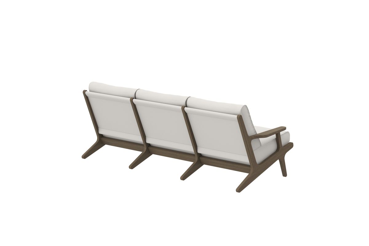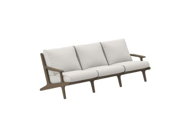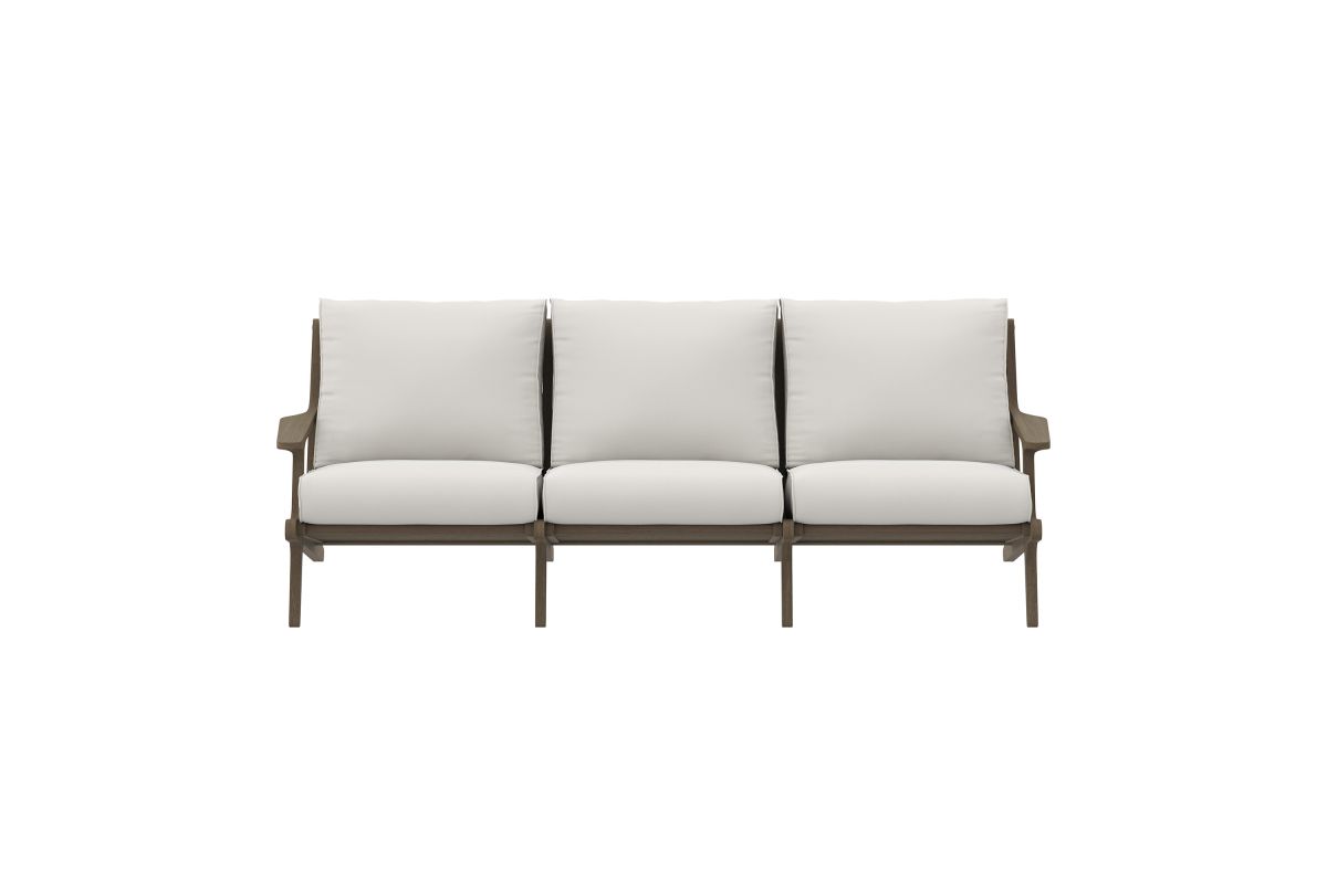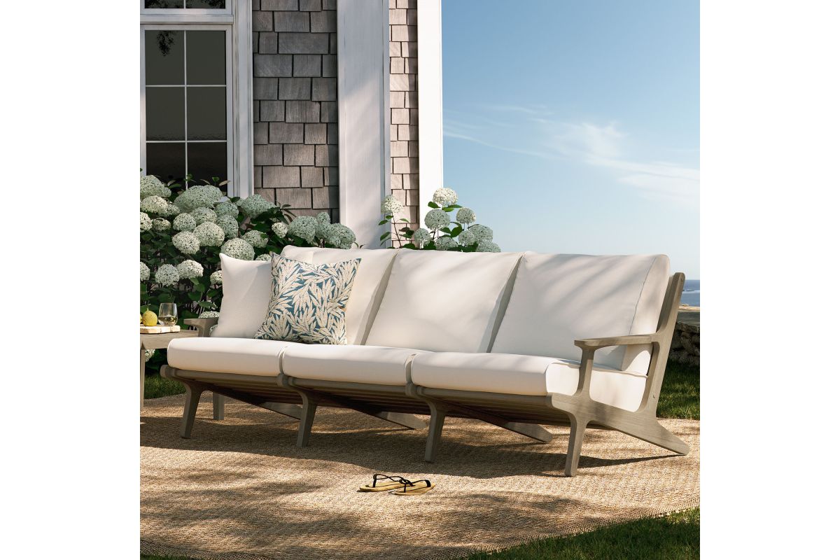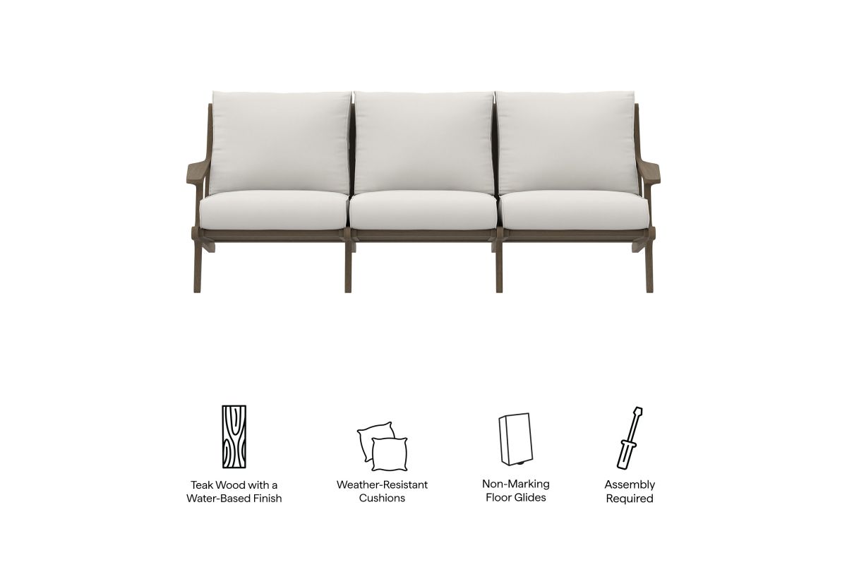 Refresh your outdoor space with the Saratoga Patio Sofa. Expertly crafted from durable teak wood with a water-based finish that highlights its natural grain, this three-seater outdoor couch features an angular frame with sculpted armrests and a slatted seat foundation for lasting support. Designed for comfort and durability, the plush seat and back cushions of this outdoor furniture collection are covered in weather-resistant, water-resistant, and stain-resistant fabric, ensuring easy maintenance and year-round relaxation. Perfect for patios, porches, poolside areas, or balconies, the Saratoga Teak Outdoor Sofa blends modern design with timeless craftsmanship. Assembly required. Weight Capacity: 500 lbs.