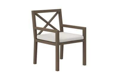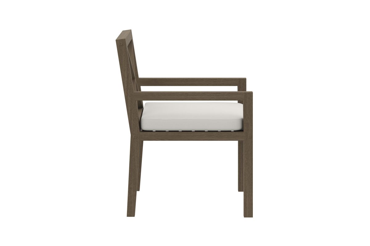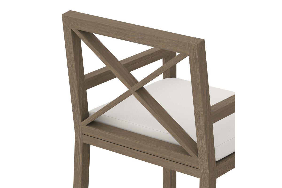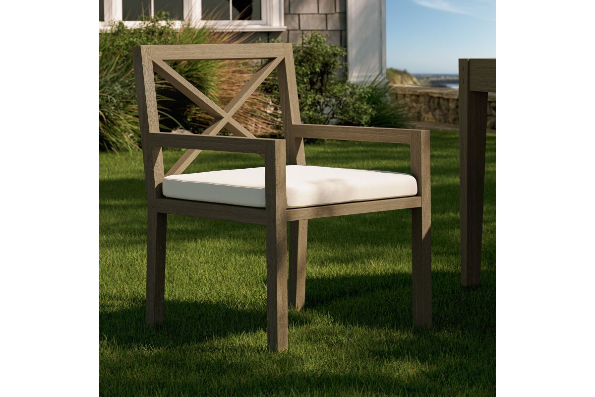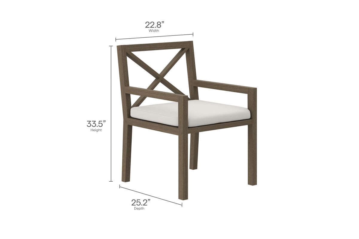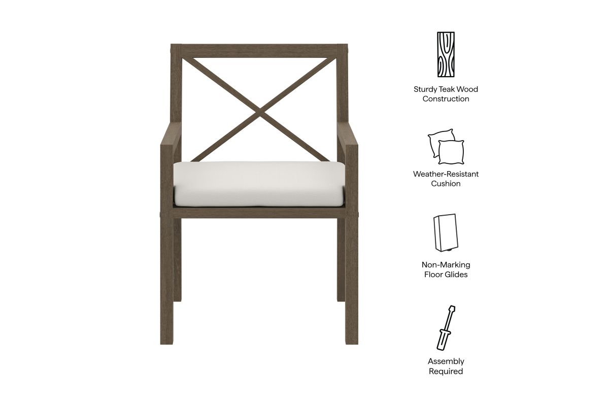 Soak in nature’s beauty while dining al fresco with the Northlake Outdoor Teak Dining Chair, a stylish and durable addition to any patio or deck. Expertly crafted from sturdy teak wood, this outdoor dining armchair features a distinctive cross-back design that enhances both support and aesthetic appeal. The slatted seat base promotes airflow and durability, while the plush, all-weather cushion offers water-resistant, fade-resistant, and quick-drying performance for lasting comfort. Whether gathered around a dining table or used as a standalone accent chair, the Northlake Outdoor Patio Dining Chair blends timeless craftsmanship with modern outdoor luxury. Includes non-marking floor glides for added protection. Assembly required. Weight Capacity: 500 lbs.