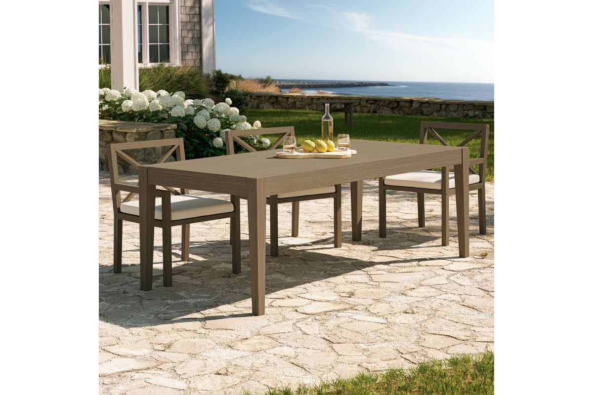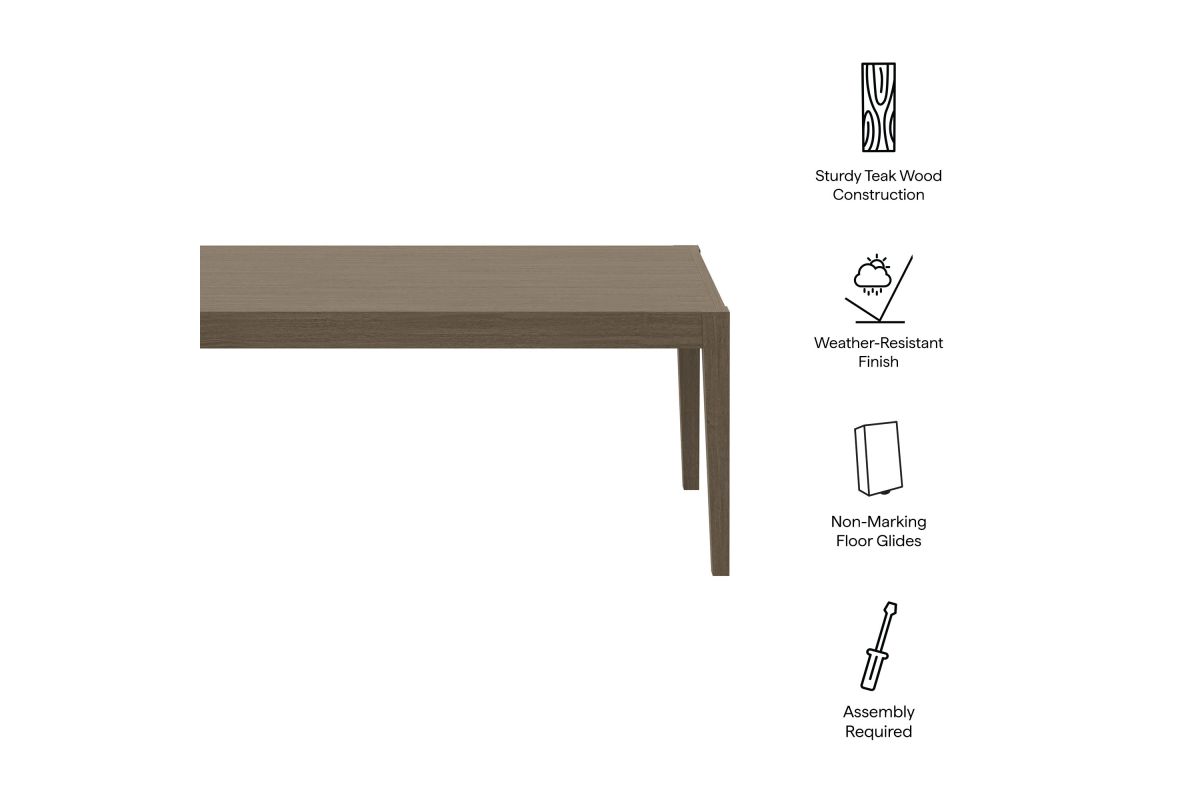Soak in nature’s beauty gathered around the Northlake Outdoor Dining Table. Crafted from durable teak wood, this 83-inch rectangle patio dining table showcases clean lines and a spacious design, comfortably seating up to eight guests. Its smooth plank-style tabletop offers a modern yet timeless aesthetic, while the sturdy tapered legs provide stability and support for outdoor dining and entertaining. Designed for patios, decks, and alfresco spaces, this contemporary outdoor teak dining table blends elegant craftsmanship with lasting durability. Assembly required.