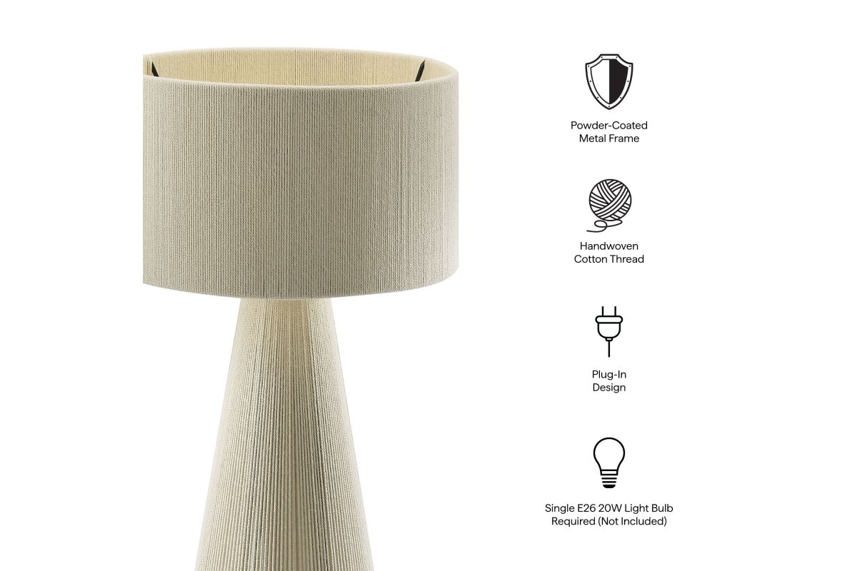 Add a stylish, modern touch to your space with the Gia Table Lamp. Featuring a bold striped design, or a plain natural rope design, this trendy lamp combines a powder-coated metal frame with a lamp shade and base made from hand-woven cotton thread, offering a chic, textured look. The repeating three-stripe pattern flows from the top of the shade to the pedestal bottom, creating a balanced, continuous pattern. Gia also comes in a plain, natural weave with no stripes for the minimalist design lover. This retro table lamp fits beautifully in contemporary European or boho style interiors, bringing an Iberian flair or Moroccan vibes to any room. UL listed, the Gia Cotton Table Lamp requires a single E26 20W bulb (not included) and features an 83" canvas color power cord, with the switch conveniently located on the inside of the lamp. Ideal as a cozy side table lamp or a unique entryway lamp, Gia arrives fully assembled and brings bohemian-inspired elegance to your home decor.