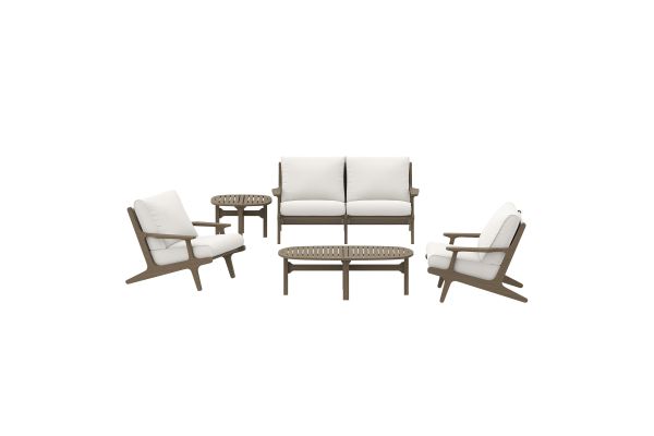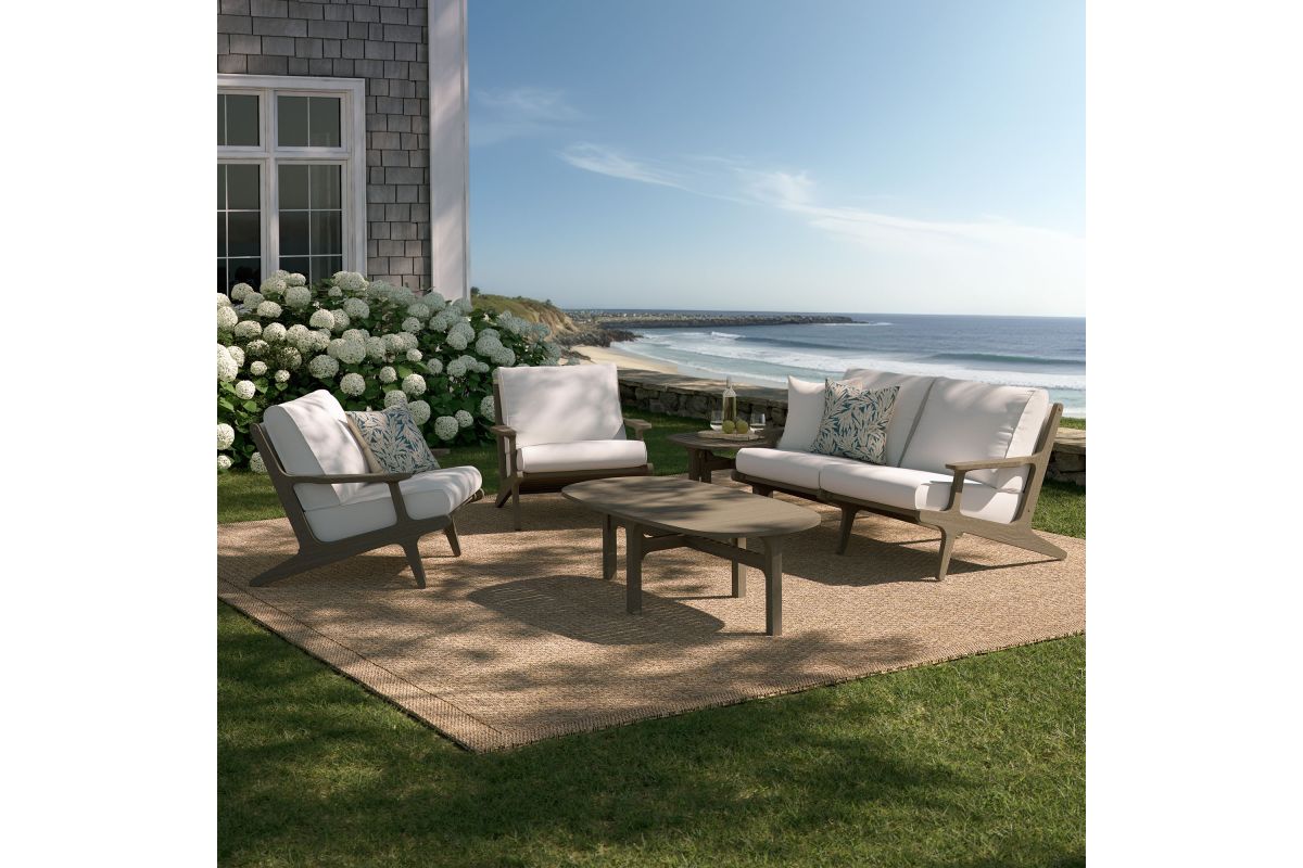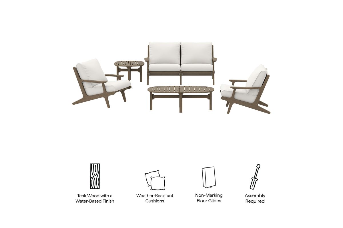 Refresh your outdoor space with the Saratoga 5-Piece Patio Furniture Set. Expertly crafted from durable teak wood with a water-based finish that highlights its natural grain, this backyard furniture set includes a loveseat, two lounge chairs, a coffee table, and a side table. The loveseat and lounge chairs feature an angular frame with sculpted armrests, slatted seat foundations, and plush seat and back cushions covered in weather-resistant, water-resistant, and stain-resistant fabric for easy maintenance and year-round relaxation. The coffee and side tables boast a beautifully slatted top with an intersecting stretcher base, offering both durability and a refined silhouette. Perfect for patios, porches, and outdoor lounge areas, the Saratoga 5 Piece Patio Set blends modern design with timeless craftsmanship. Assembly required.