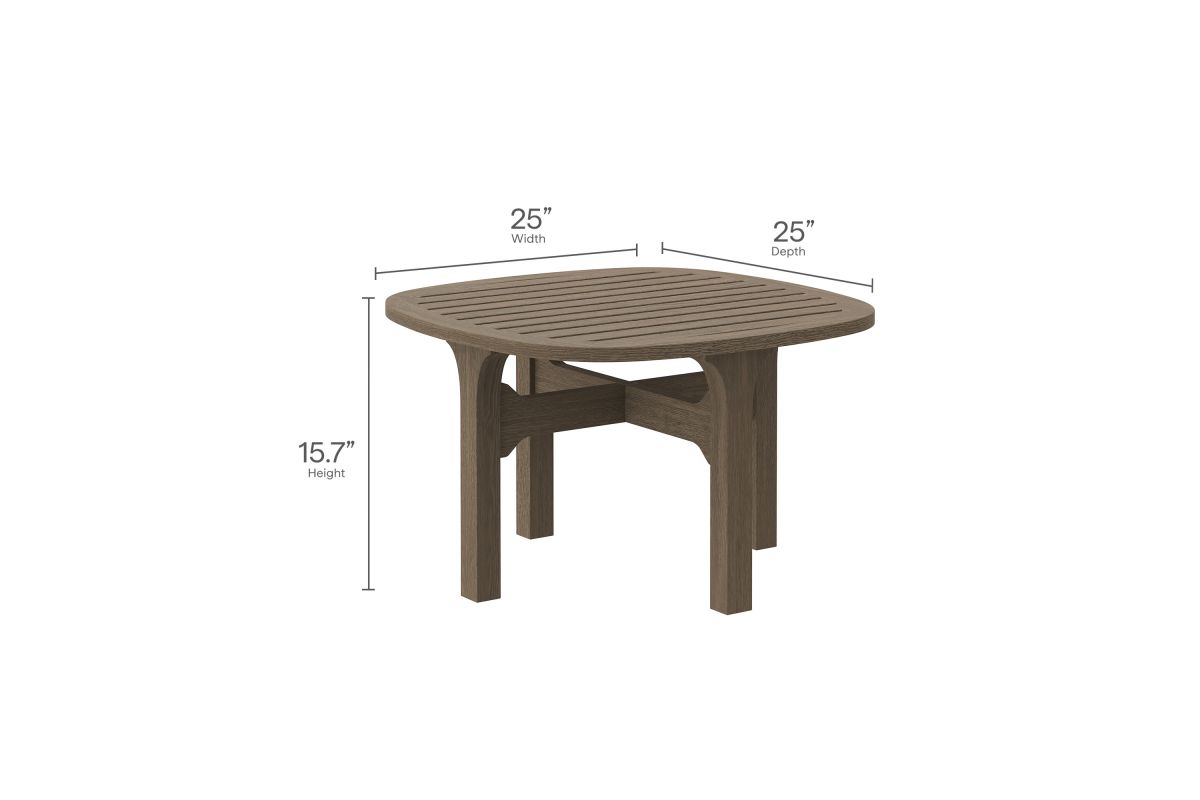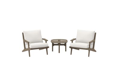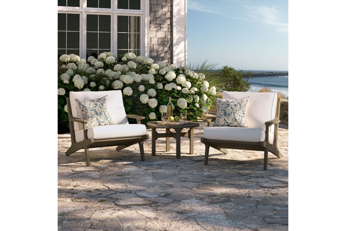 Refresh your outdoor space with the Saratoga 3-Piece Patio Furniture Set. Expertly crafted from durable teak wood with a water-based finish that highlights its natural grain, this backyard furniture set includes two lounge chairs and a side table. The lounge chairs feature an angular frame with sculpted armrests, slatted seat foundations, and plush seat and back cushions covered in weather-resistant, water-resistant, and stain-resistant fabric for easy maintenance and year-round relaxation. The side table boasts a beautifully slatted top with an intersecting stretcher base, offering both durability and a refined silhouette. Perfect for patios, porches, and outdoor lounge areas, the Saratoga 3-Piece Patio Set blends modern design with timeless craftsmanship. Assembly required.