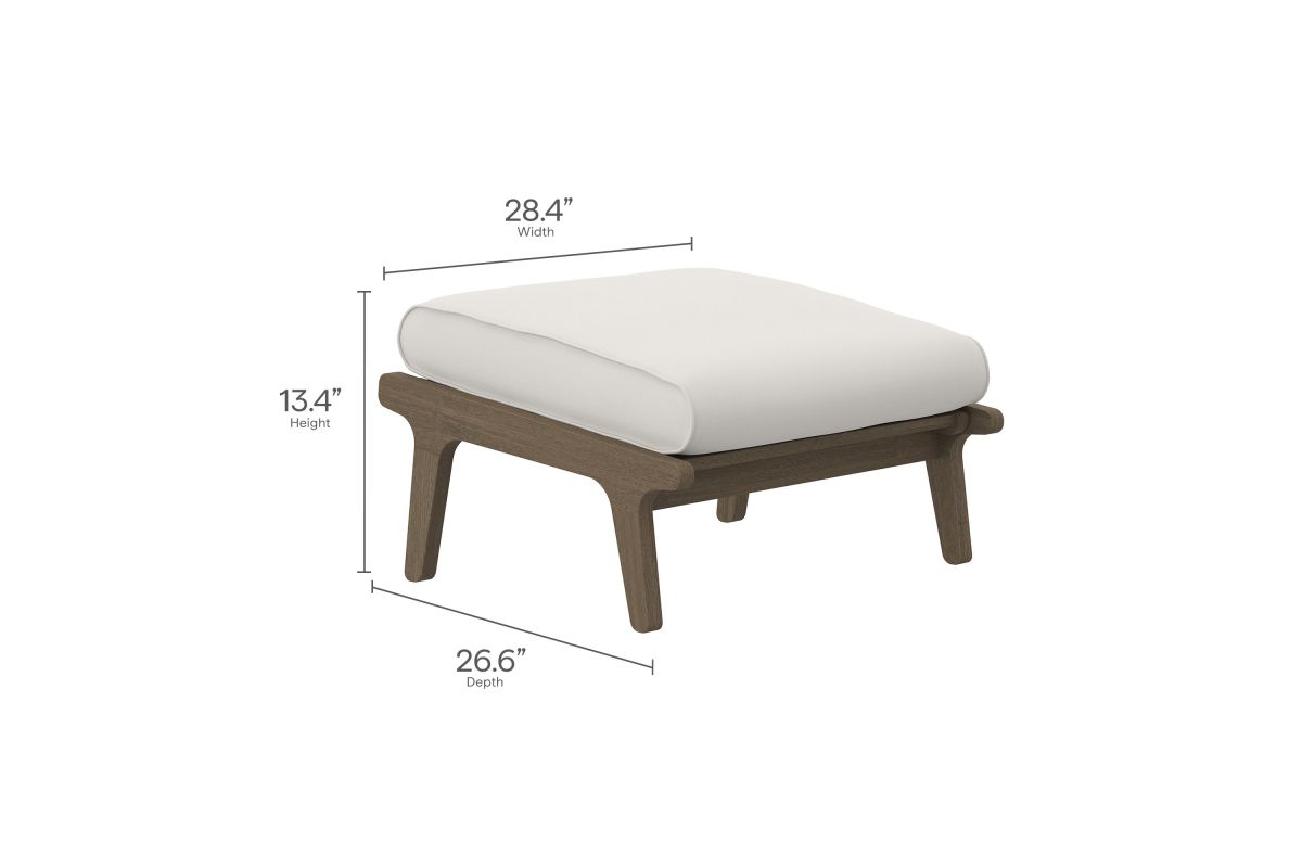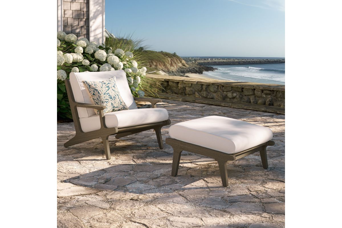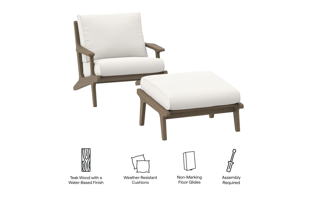 Refresh your outdoor space with the Saratoga Outdoor Chair and Ottoman Set. Expertly crafted from durable teak wood with a water-based finish that highlights its natural grain, this patio chair set includes one armchair and one ottoman. The armchair and footstool both feature an angular frame with sculpted armrests and a slatted seat foundation, paired with plush cushions covered in weather-resistant, water-resistant, and stain-resistant fabric for easy maintenance and lasting comfort. Perfect for patios, porches, and outdoor lounge areas, the Saratoga patio chair with ottoman blends modern design with timeless craftsmanship. Assembly required.