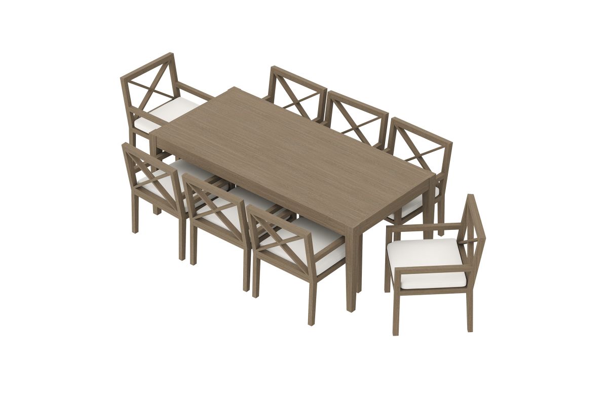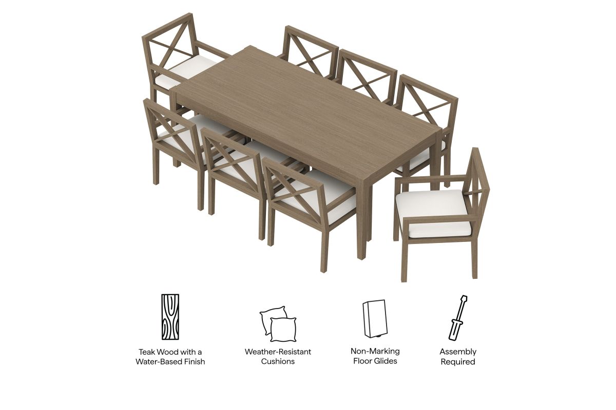 Soak in nature’s beauty with the Northlake 9-Piece Outdoor Patio Dining Set, featuring a spacious dining table and eight matching armchairs. All crafted from durable teak wood, the 83-inch rectangular table showcases clean lines and a smooth plank-style top, creating a modern yet timeless setting for outdoor dining. The coordinating armchairs are designed with distinctive cross-back frames for added support and a refined aesthetic. Each patio chair includes a plush, all-weather cushion that is water-repellent, fade-resistant, and quick-drying for lasting comfort, while slatted seat bases encourage airflow and durability. Perfect for patios, decks, and garden gatherings, this teak patio dining set blends elegant craftsmanship with lasting outdoor performance. Includes non-marking floor glides for added protection. Assembly required.