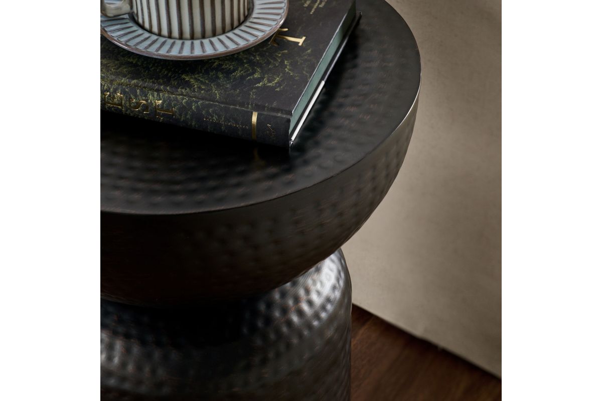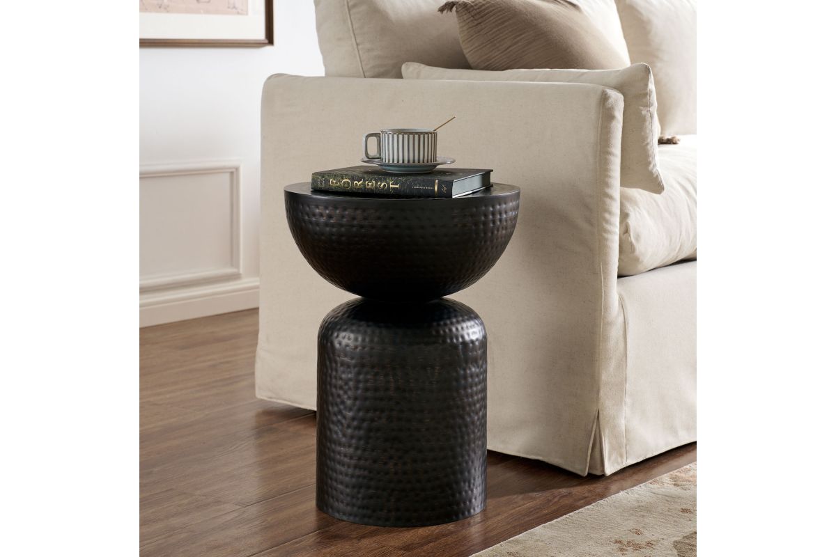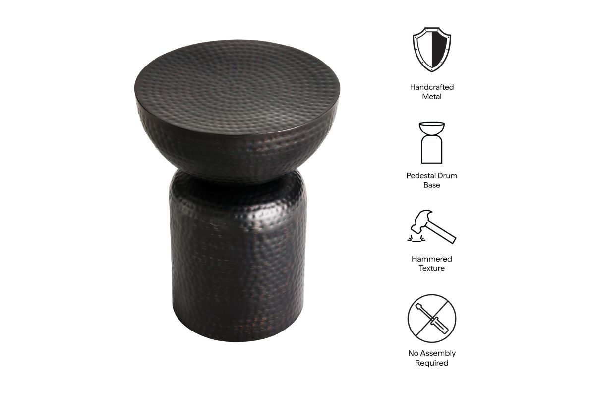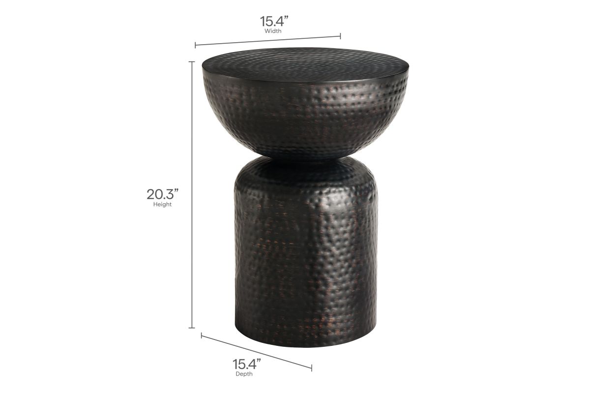 Introduce a sculptural touch to any room with the Mella Hammered Modern Round Side Table. Featuring a pedestal design with a unique hammered texture, this metal accent table makes an eye-catching addition to your home. With its distinct, rounded silhouette and handcrafted hammered detailing, Mella offers the ideal surface for displaying décor, serving drinks, or enjoying a cozy coffee moment. Perfect for use as a living room side table, a plant stand or as a funky side table for your hallway or bedroom, the Mella Pedestal Table combines style and function, making it an eye-catching addition to your living room, hallway, or bedroom. Weight Capacity: 73 lbs.