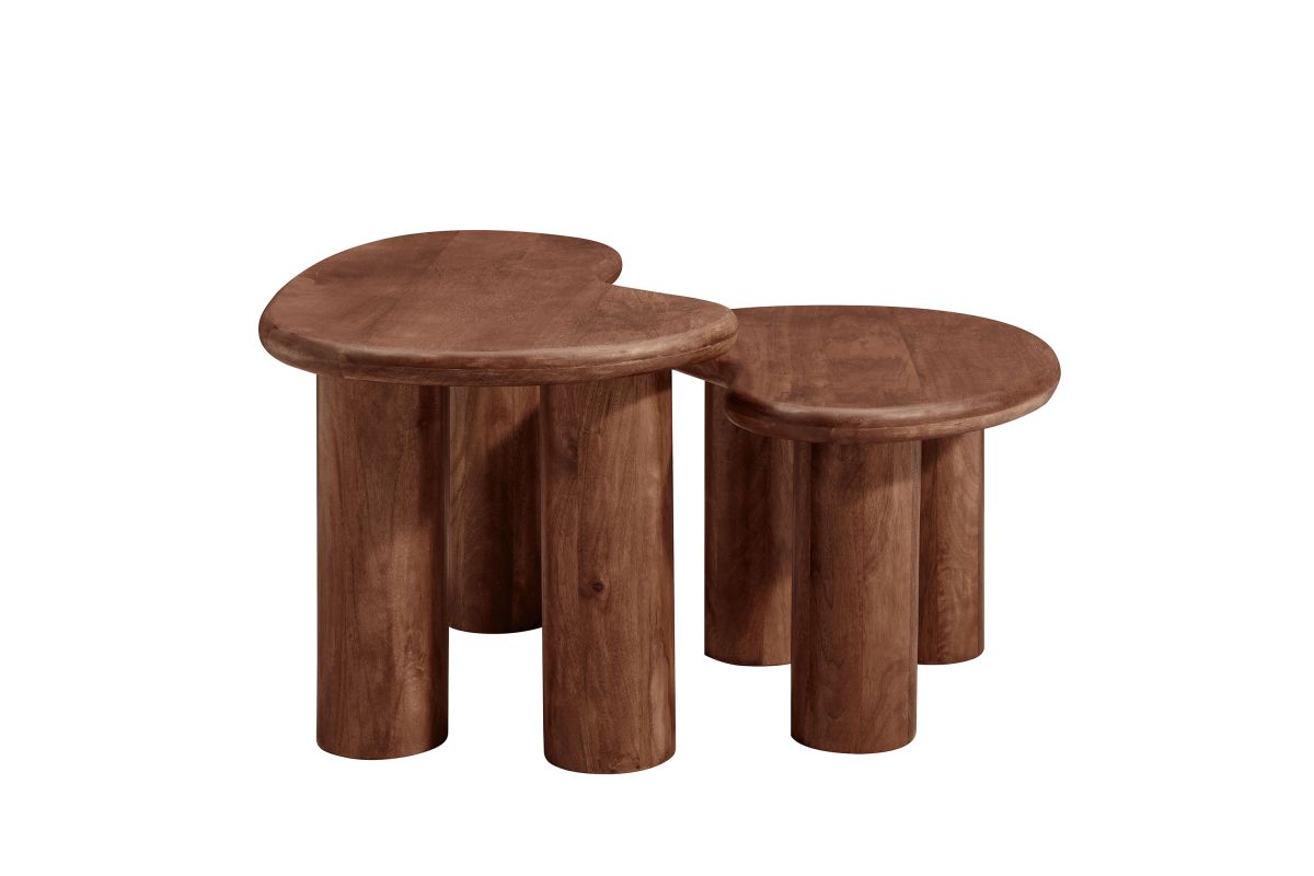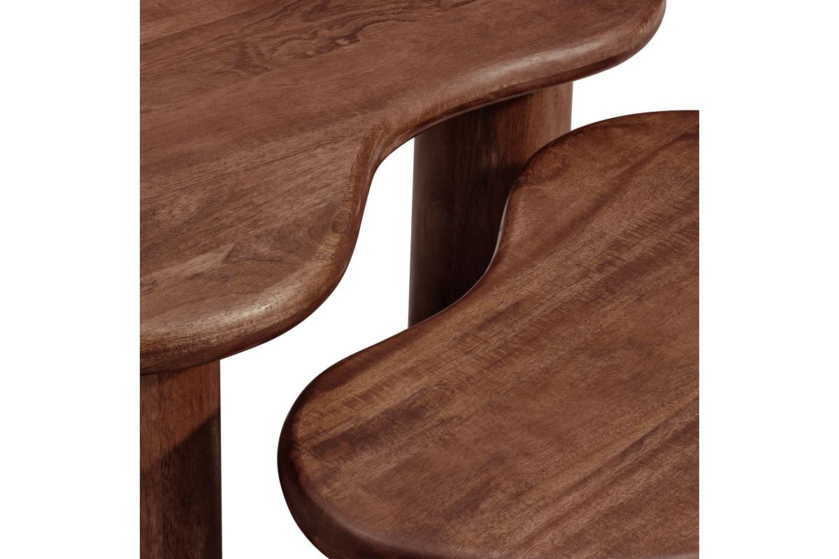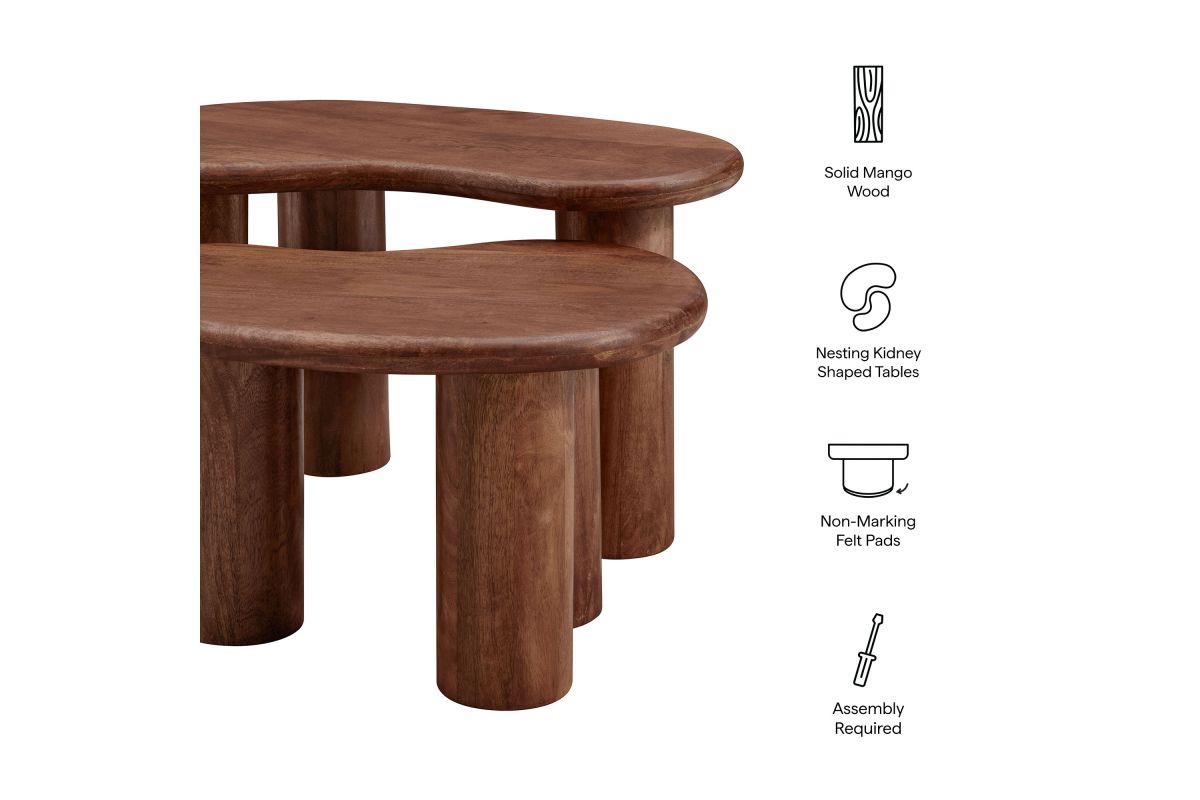 Sculptural, functional, and uniquely modern – the Hackney Nesting Coffee Table Set is a statement piece for your home. Made from solid mango wood, this set features two kidney-shaped tables, with one larger than the other, that can be nested together as a bold coffee table or separated into stylish side or end tables to suit your needs. The convenient nesting design offers flexibility, allowing you to adjust the layout of your space with ease. Each table is supported by three sturdy legs, and non-marking felt pads ensure your floors remain scratch-free. The Hackney Mango Wood Nesting Coffee Table Set of 2 is perfect for those who want a stylish, wood coffee table that fits into any modern living room, whether it's spacious or cozy. Assembly required. Weight Capacity: 200 lbs