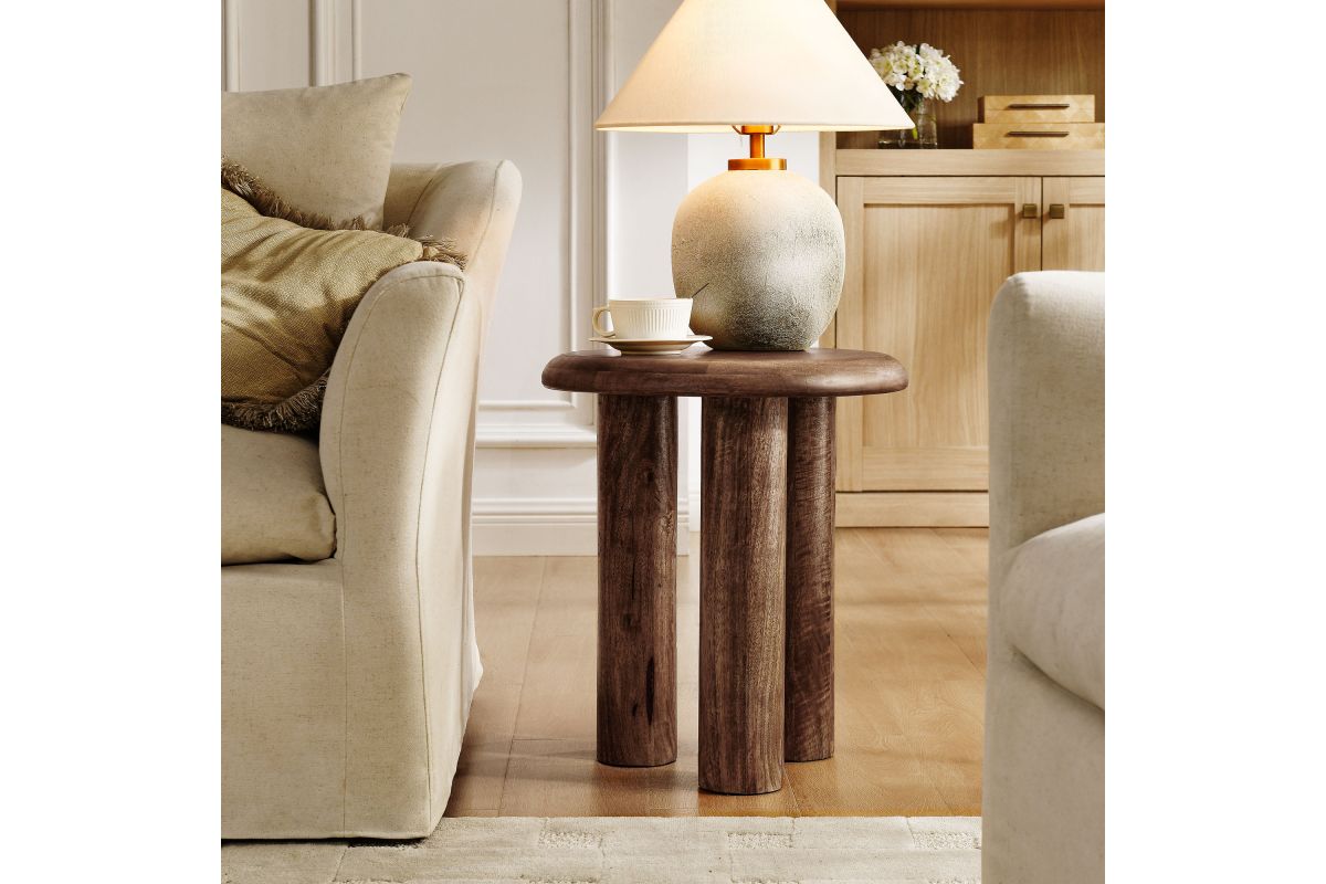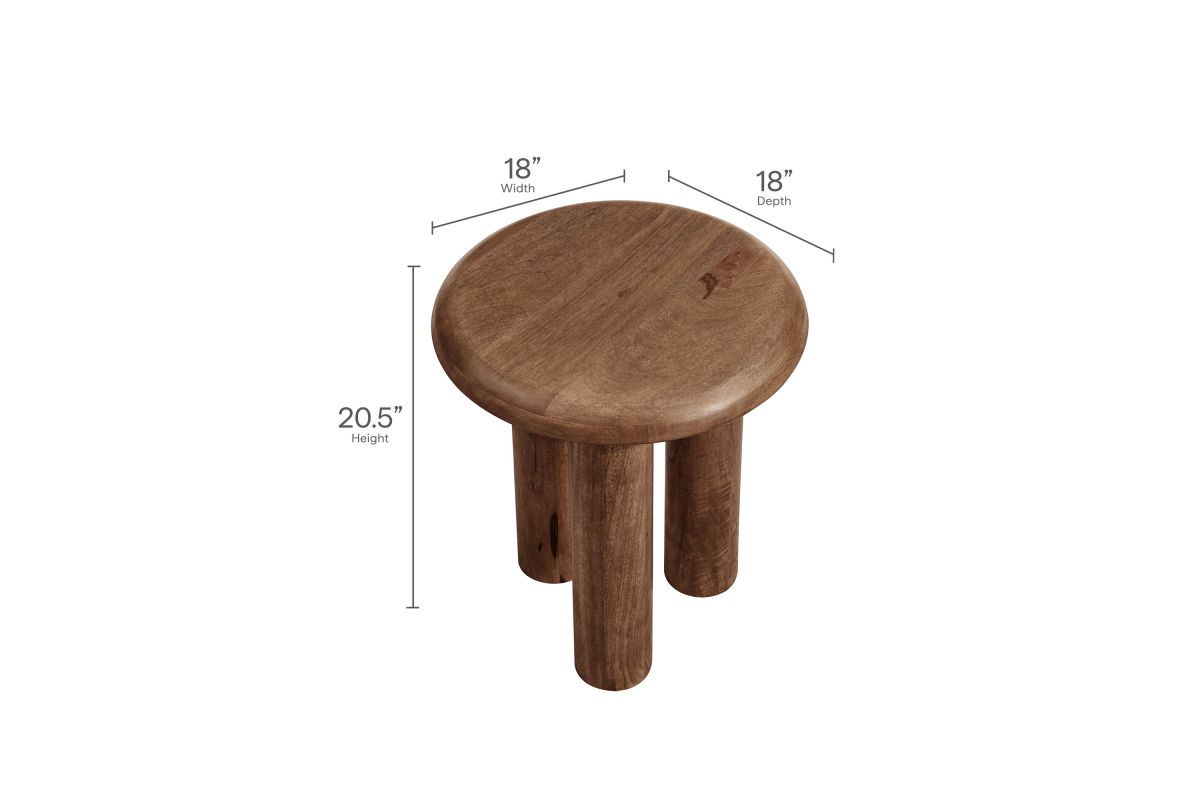 Simple, functional, and unique – the Mavina Round Side Table complements any modern décor. Made from solid mango wood, this end table features a bold round design with three sturdy legs, offering a clean and minimalist look. The compact size allows it to fit seamlessly into any space, whether next to your sofa or in a cozy corner. Non-marking felt pads protect your floors from scratches while maintaining a sleek and stable profile. The Mavina Mango Wood Round Side Table is perfect for those looking to add style and warmth to any living area. Assembly required. Weight Capacity: 200 lbs.