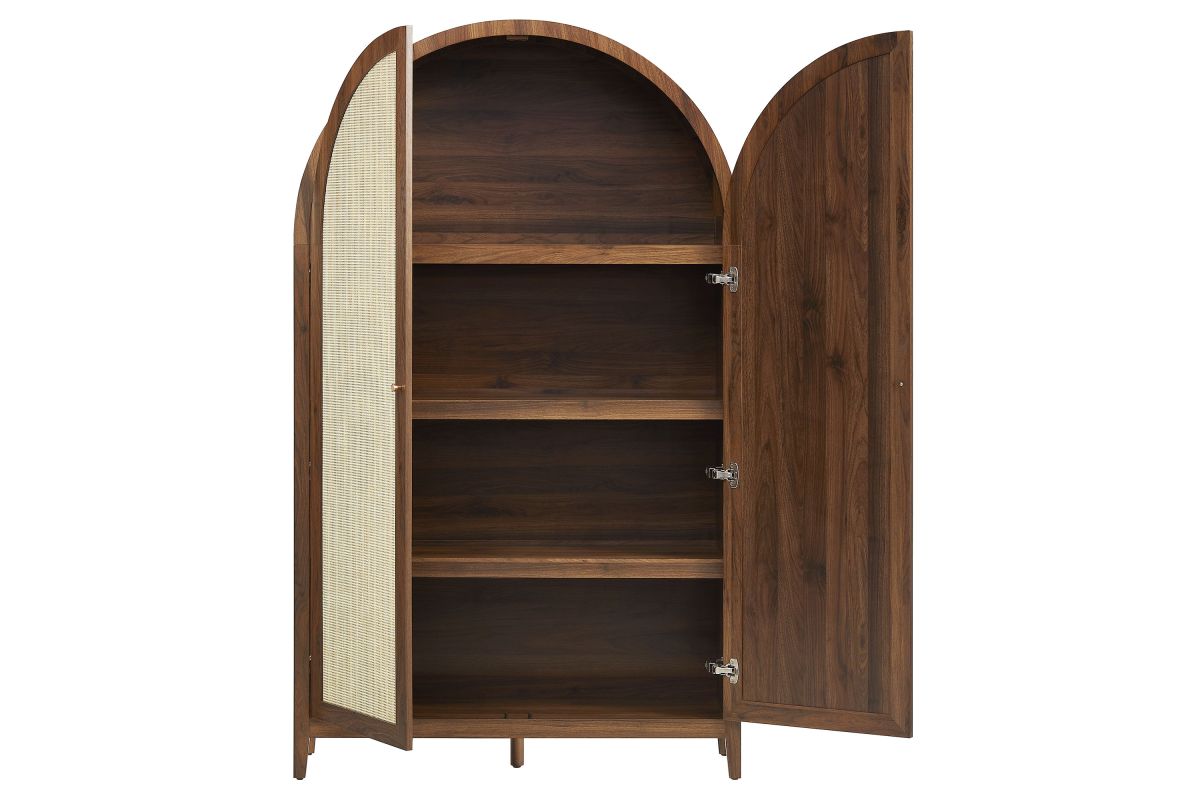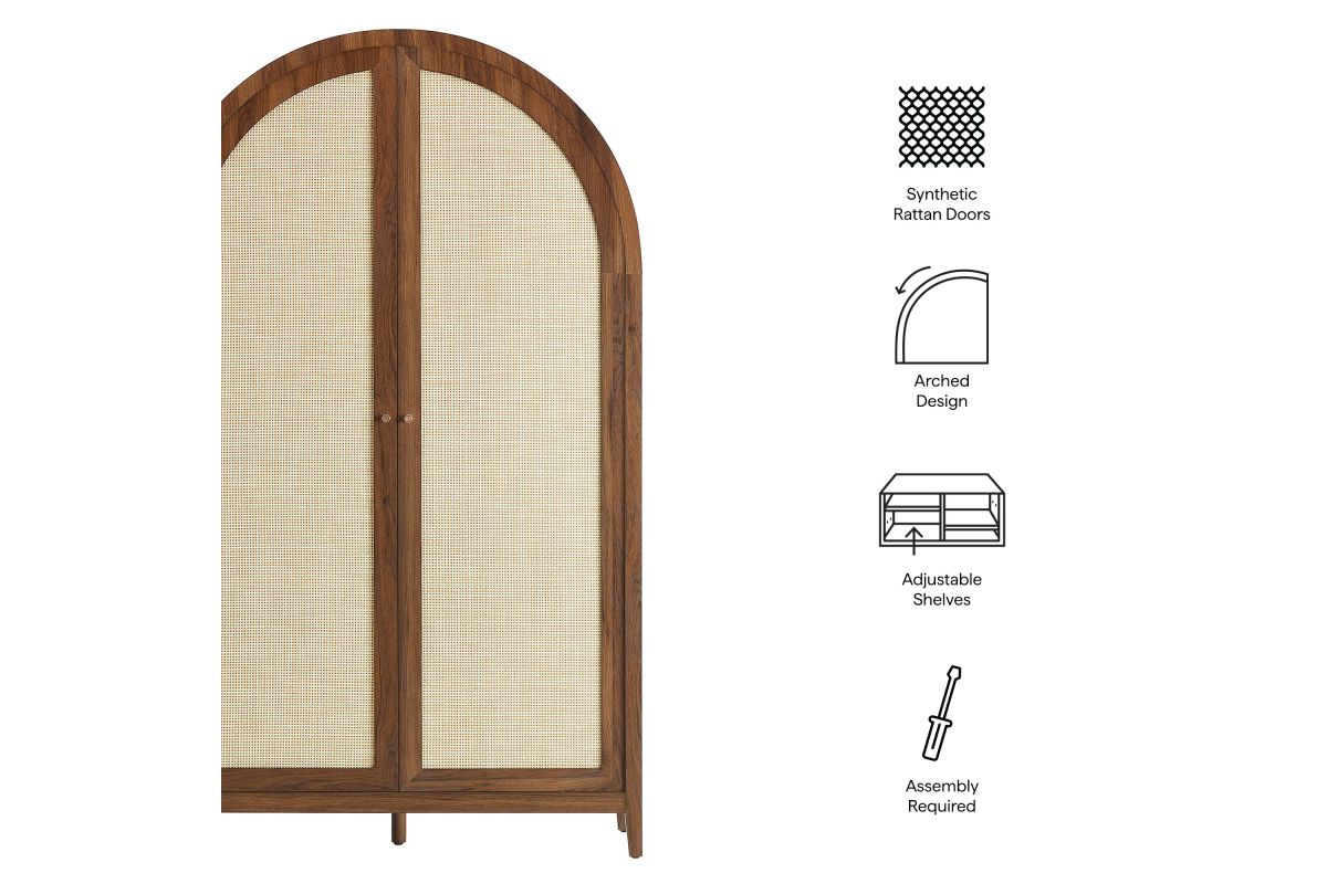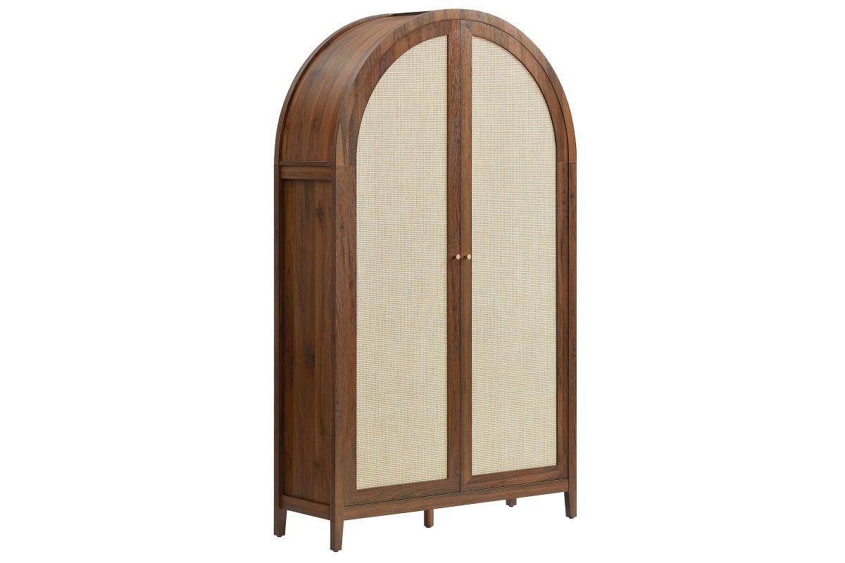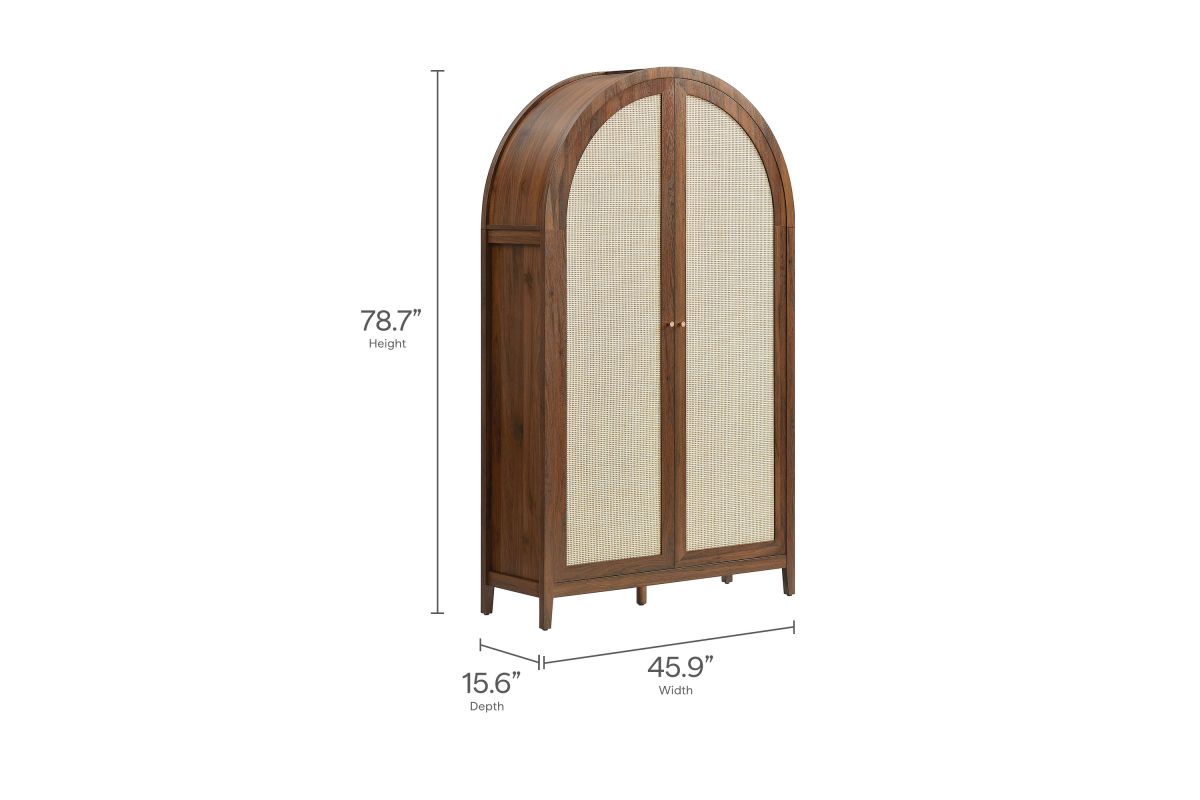 Infuse warmth and elegance into your home with the Calista Arched Storage Cabinet. Standing at 79 inches tall, this spacious linen cabinet blends modern farmhouse charm with functional organization. The gracefully curved arched silhouette is complemented by synthetic rattan paneling on the wood grain laminate doors, offering a natural woven texture with enhanced durability. Perfect for storing linens, seasonal decor, or household essentials, Calista features two adjustable shelves, allowing you to customize the interior space to fit your needs. The soft-close hinges ensure smooth operation, while non-marking adjustable levelers provide stability on any surface. Whether placed in an office, hallway, or living room, this tall storage cabinet with doors and shelves serves as a stylish and practical solution for everyday organization. Assembly required.