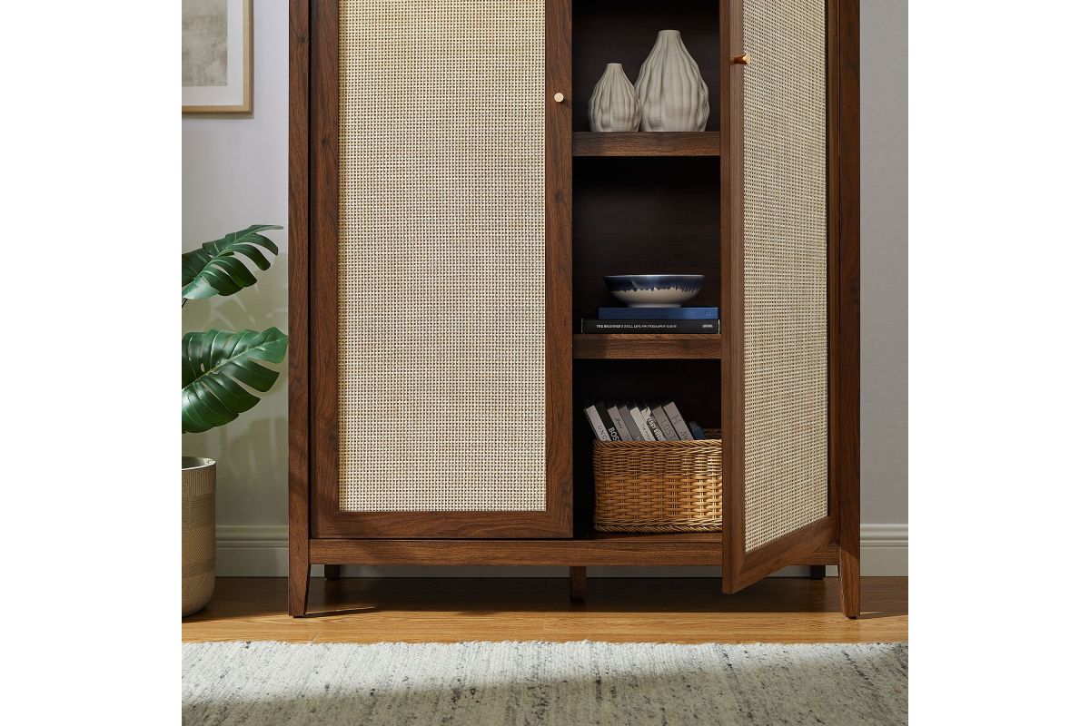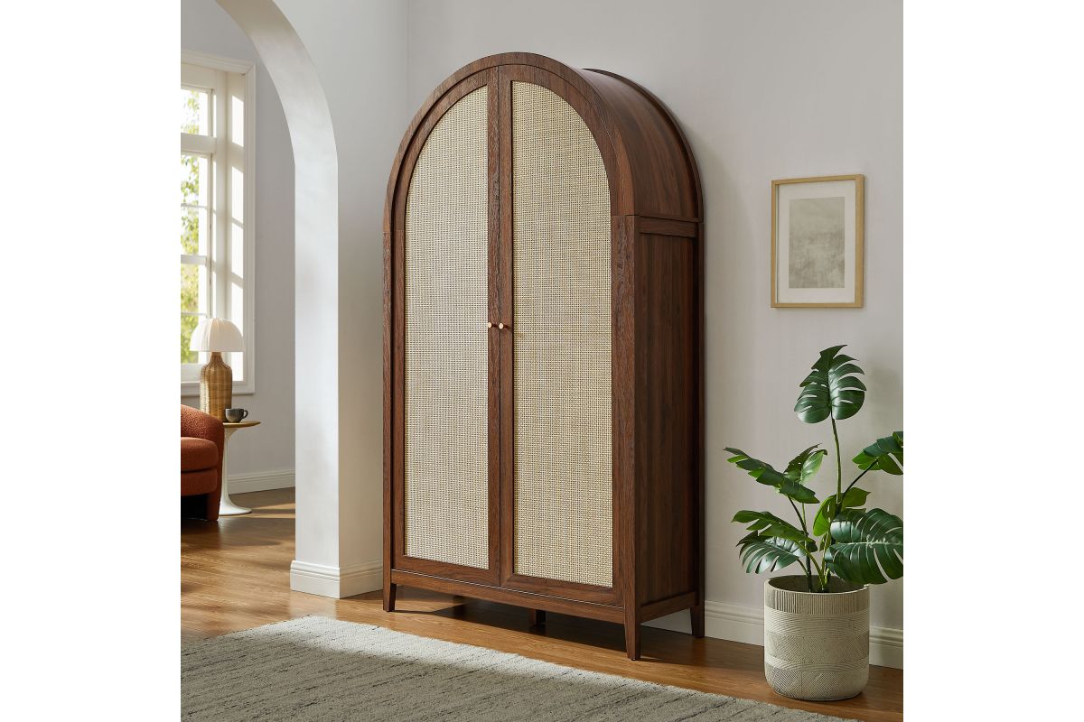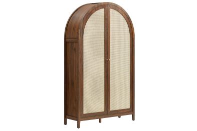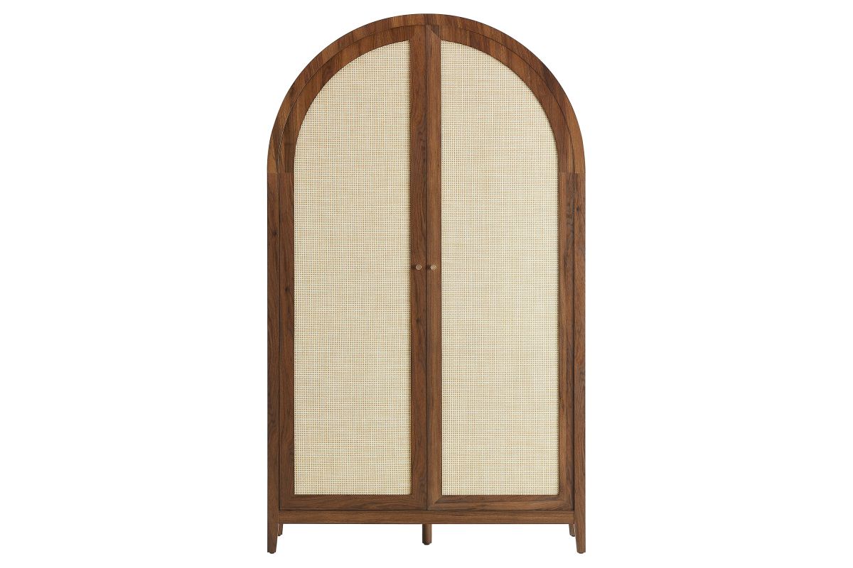 Infuse warmth and elegance into your home with the Calista Arched Storage Cabinet. Standing at 79 inches tall, this spacious linen cabinet blends modern farmhouse charm with functional organization. The gracefully curved arched silhouette is complemented by synthetic rattan paneling on the wood grain laminate doors, offering a natural woven texture with enhanced durability. Perfect for storing linens, seasonal decor, or household essentials, Calista features two adjustable shelves, allowing you to customize the interior space to fit your needs. The soft-close hinges ensure smooth operation, while non-marking adjustable levelers provide stability on any surface. Whether placed in an office, hallway, or living room, this tall storage cabinet with doors and shelves serves as a stylish and practical solution for everyday organization. Assembly required.