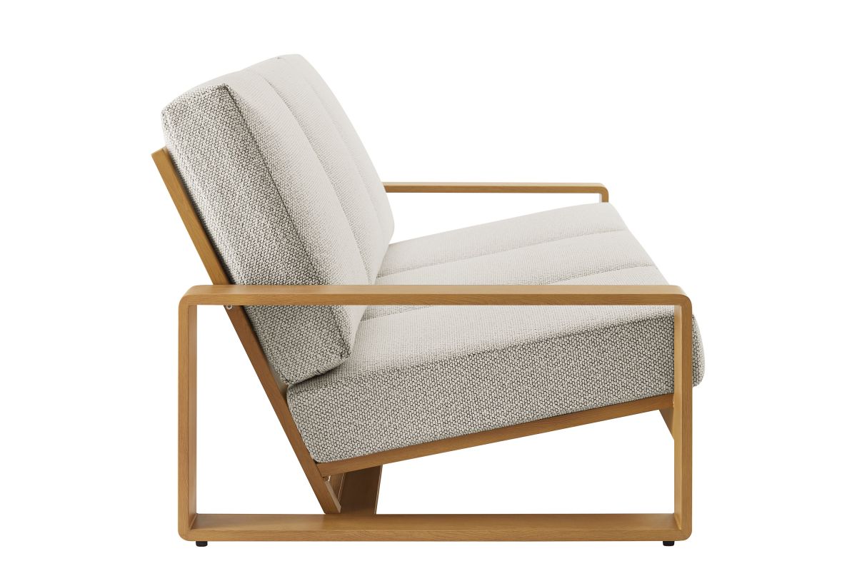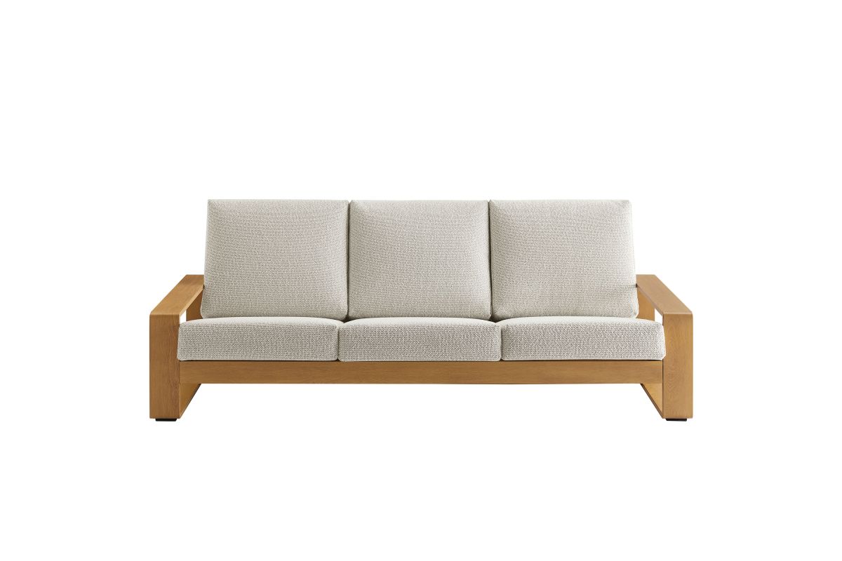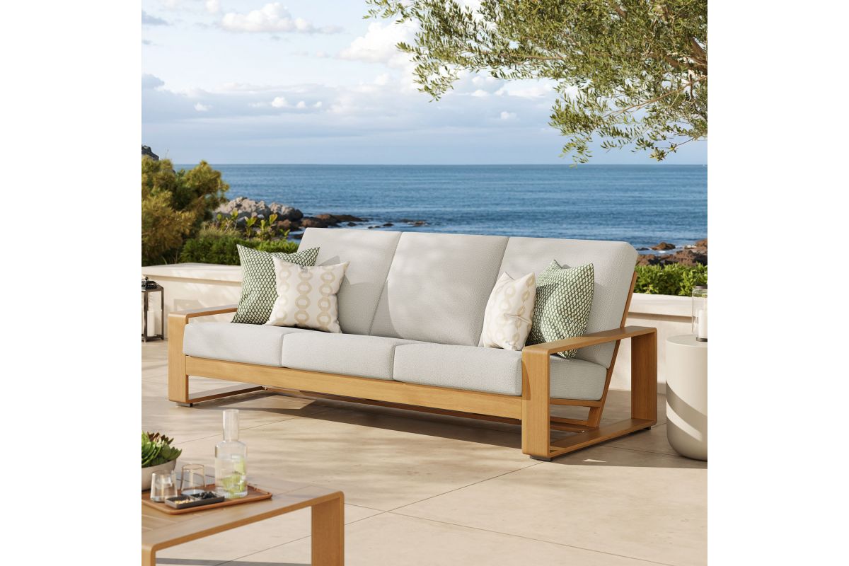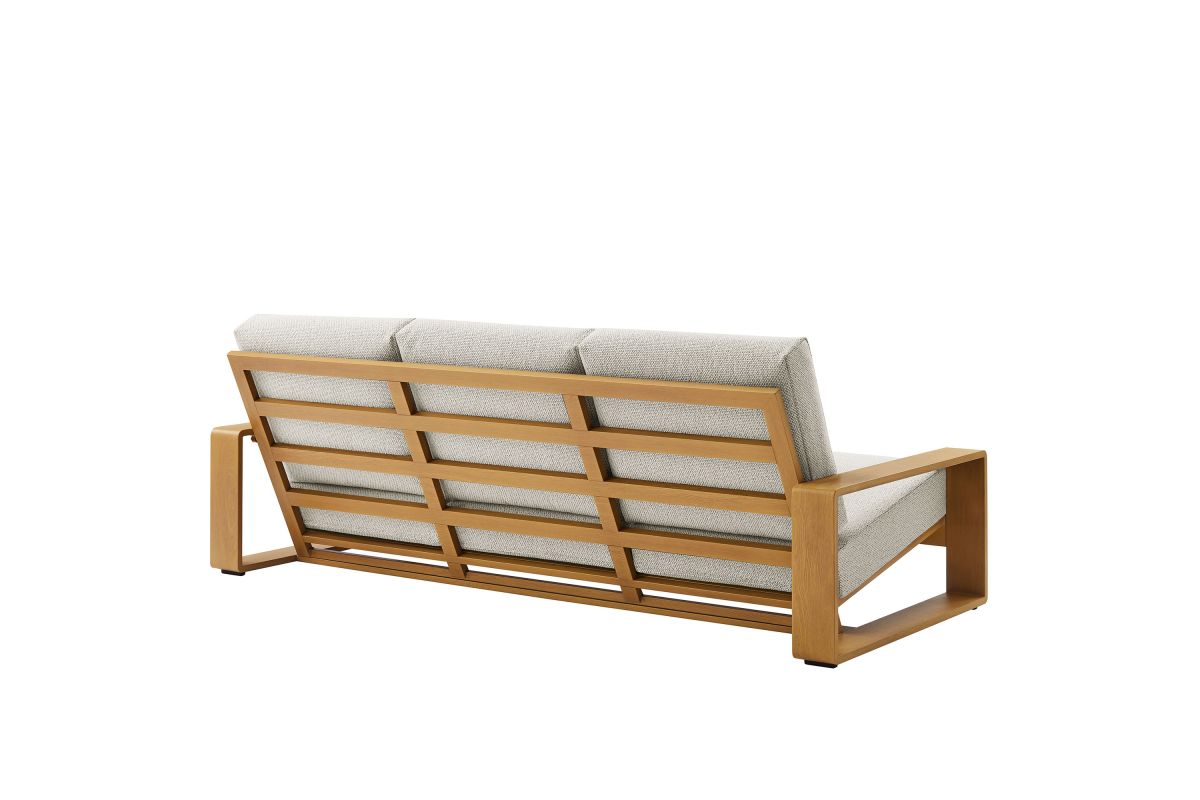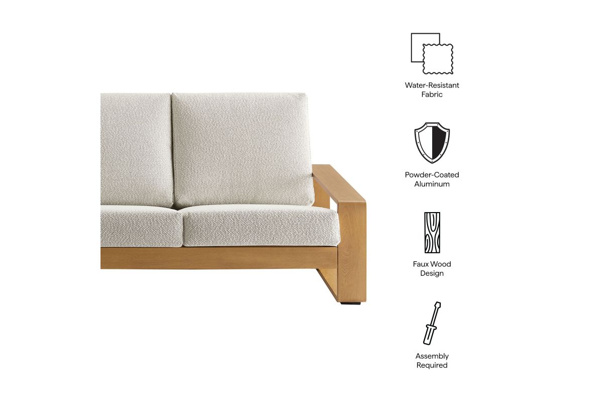 Unwind in sculptural sophistication with the Lirienne Outdoor Patio Sofa. Designed for modern relaxation, this statement-making 3-seater outdoor couch showcases a sleek, rectangular frame crafted from durable powder-coated aluminum with a faux wood pattern, offering both resilience and style. The deep, angled seat and plush foam cushions invite you to sink into lasting comfort, while the subtle textured weave upholstery is stain-resistant, weather-resistant, and easy to maintain with removable, washable covers. The Lirienne Aluminum Patio Sofa is as practical as it is stylish, making it the perfect outdoor retreat for backyard lounging. Whether placed on a sun-drenched deck or a shaded patio, this all-weather aluminum outdoor patio sofa brings an air of refined ease to any alfresco setting. Weight Capacity: 750 lbs.