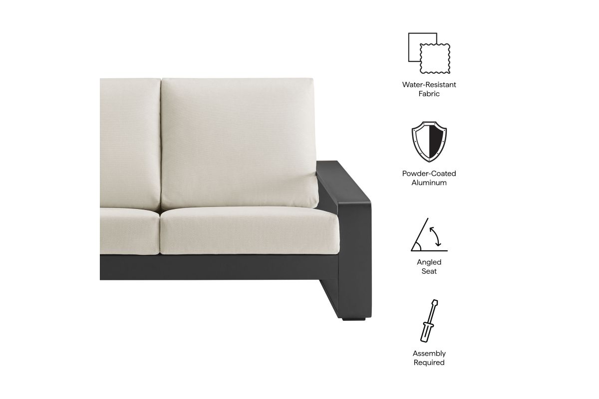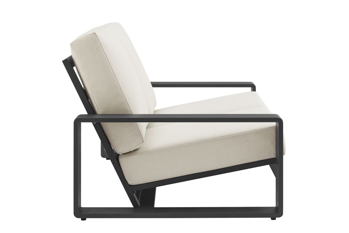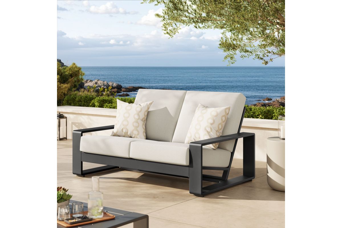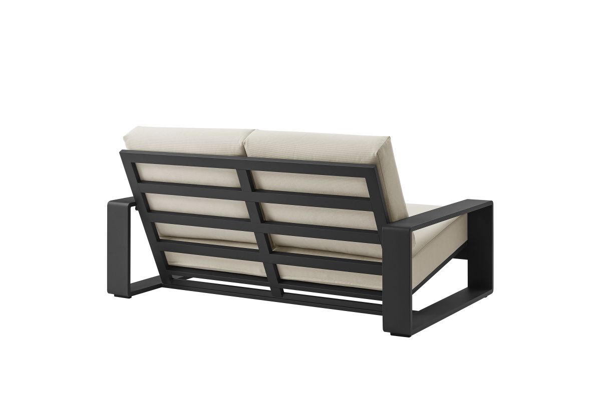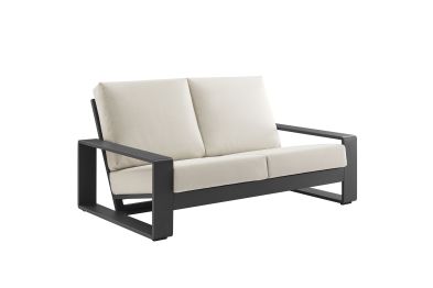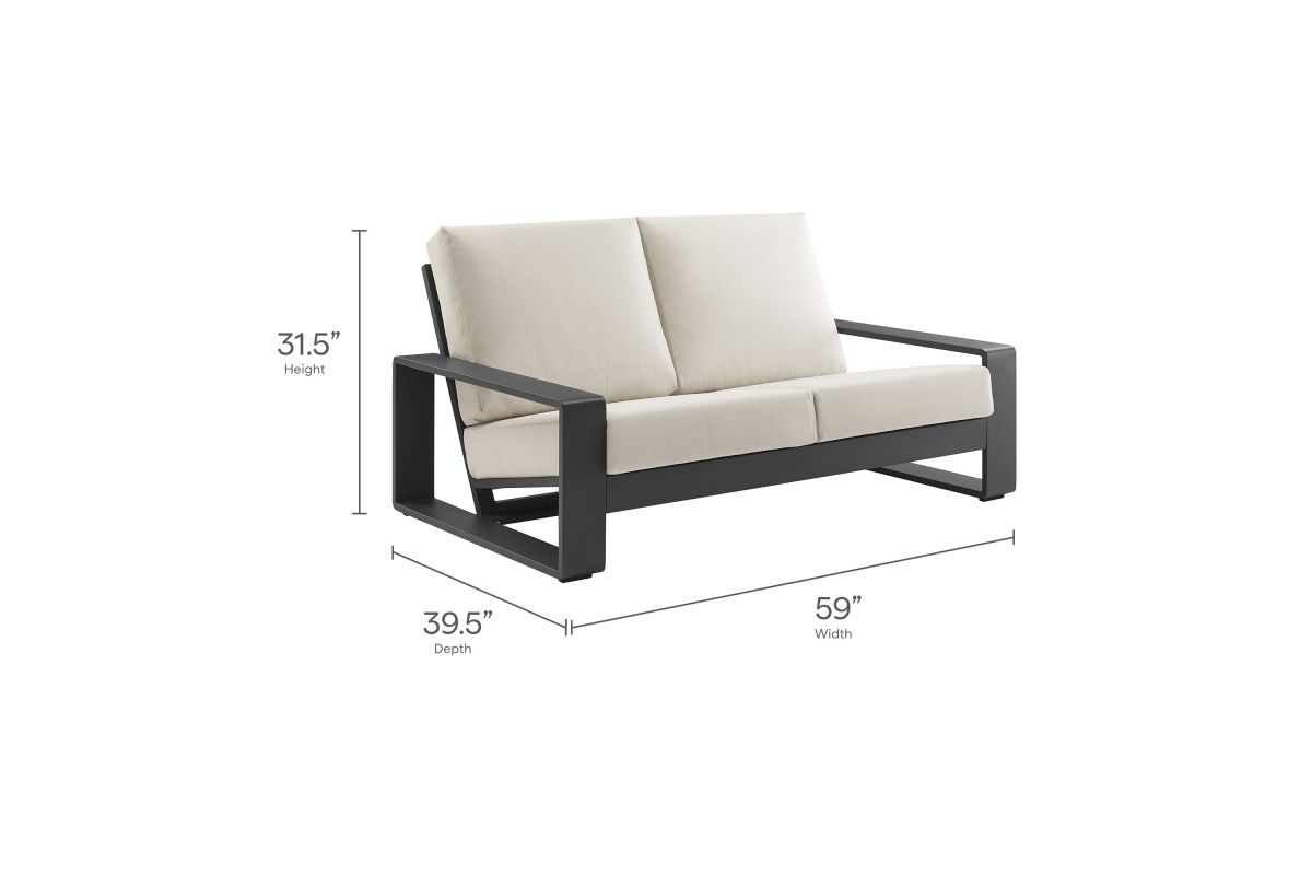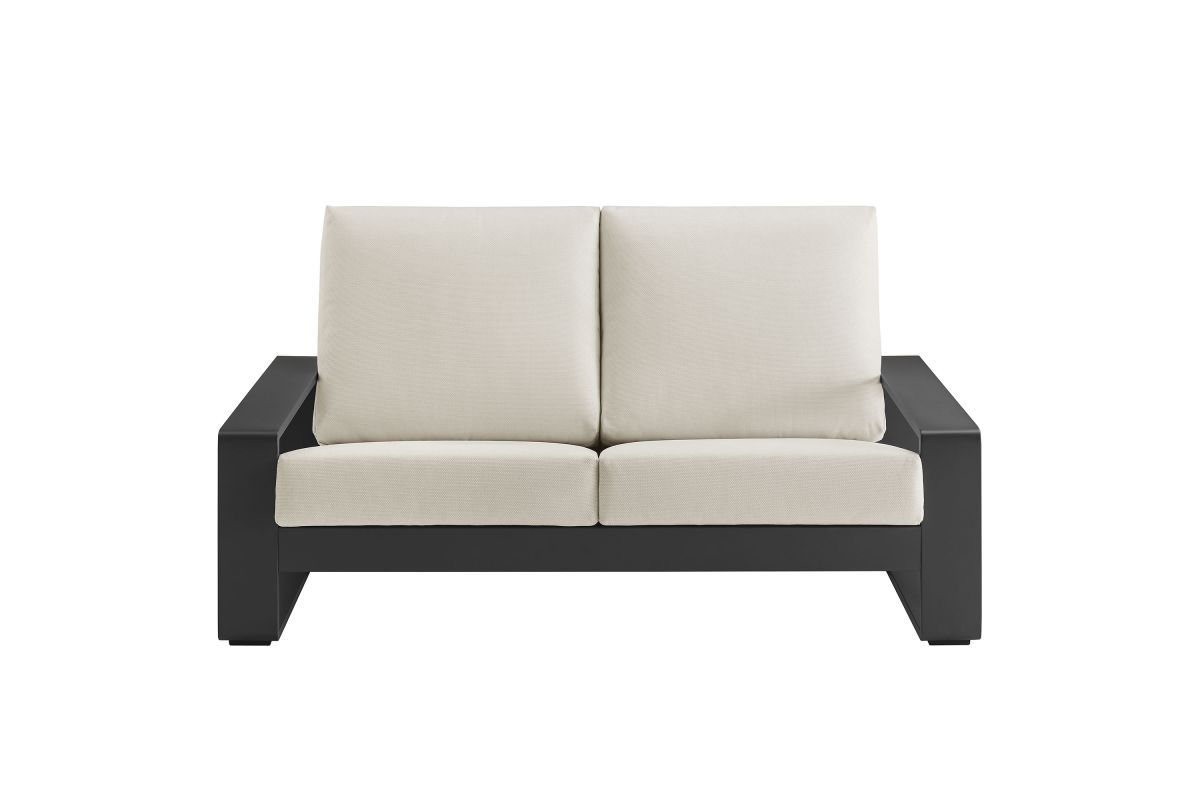 Unwind in sculptural sophistication with the Lirienne Outdoor Patio Loveseat. Designed for modern relaxation, this statement-making 2-seater sofa showcases a sleek, rectangular frame crafted from durable powder-coated aluminum, offering both resilience and style. The deep, angled seat and plush foam cushions invite you to sink into lasting comfort, while the smooth, weather-resistant upholstery is stain-resistant and easy to maintain with removable, washable covers. The Lirienne Aluminum Small Outdoor Couch is as practical as it is stylish, making it the perfect outdoor retreat for backyard lounging. Whether placed on a sun-drenched deck or a shaded patio, this outside couch brings an air of refined ease to any alfresco setting. Weight Capacity: 501 lbs.
