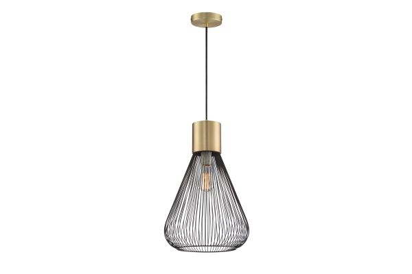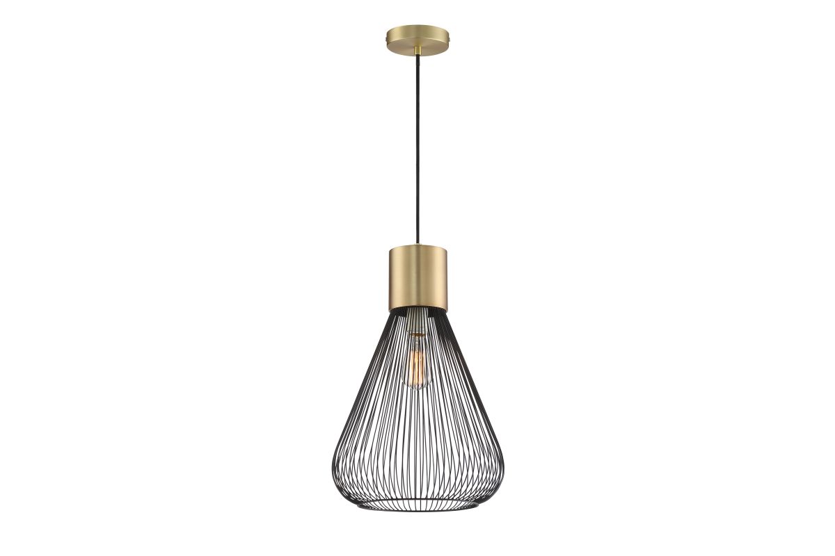 Elevate your space with this eye-catching pendant light that combines industrial flair with modern sophistication. Featuring a teardrop-shaped black wire cage and a luxurious brushed gold accent, this fixture is designed to stand out. The open design allows light to shine through beautifully, casting captivating shadows while showcasing an exposed bulb for an added vintage touch. Perfect for kitchen islands, dining areas, or entryways, this pendant light brings both style and function to any modern or eclectic interior.
