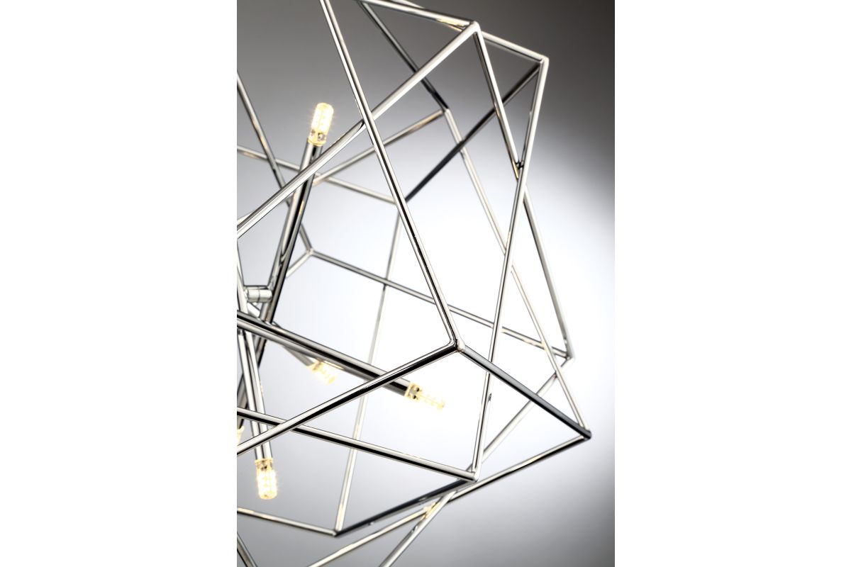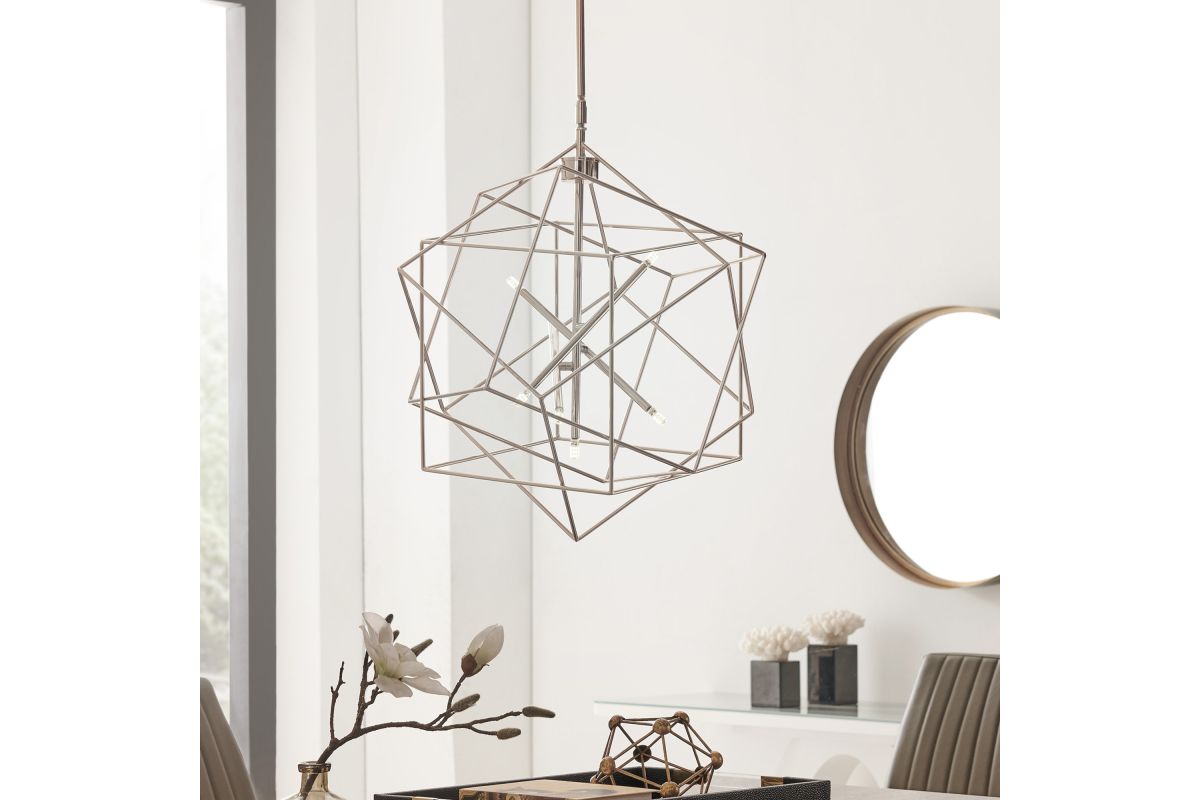 This pendant features a contemporary, sculptural design—an abstract metal cage in a chrome finish that houses the lighting elements. Its geometric form gives it a modern flair, perfect as a statement fixture over spaces like kitchen islands, entryways, or as accent lighting in living areas.