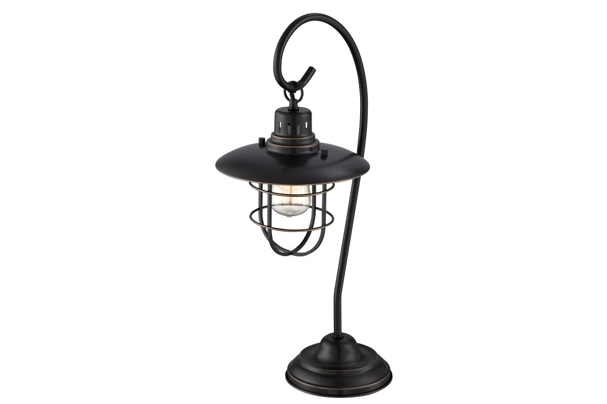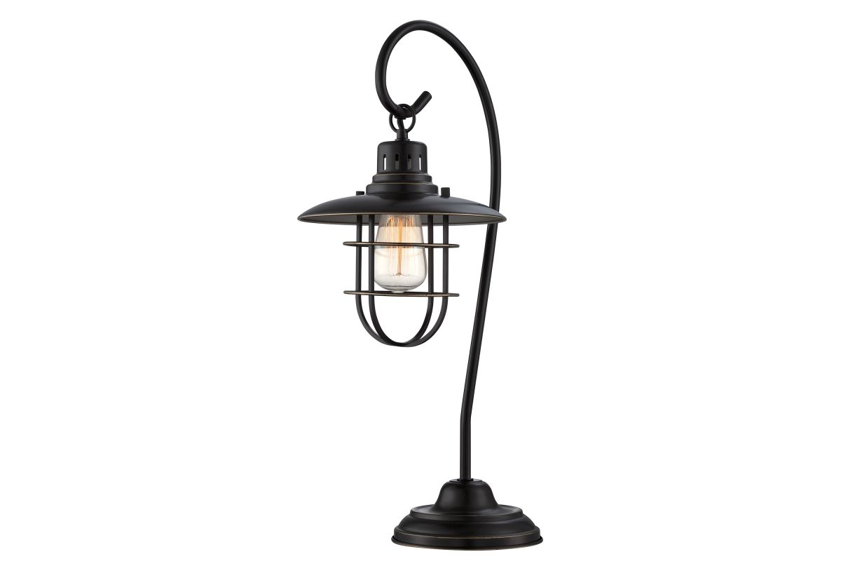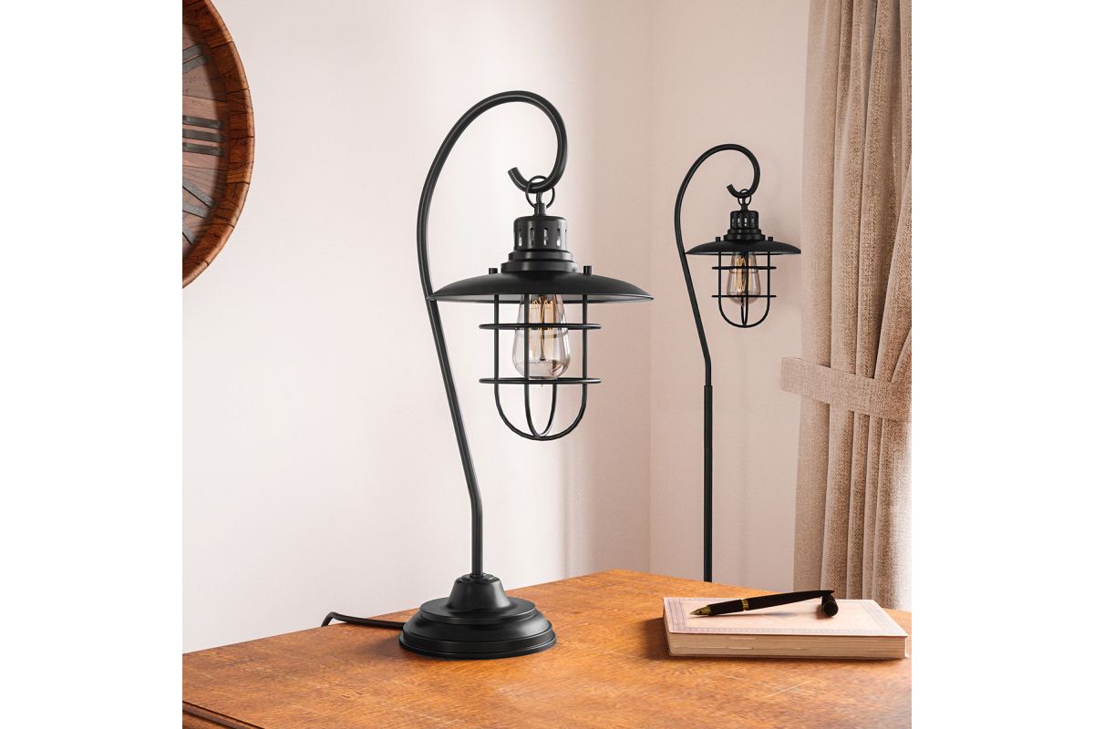 Bring classic character to your space with this vintage-inspired industrial table lamp. Featuring a lantern-style cage shade, gently curved arm, and matte black finish, this lamp blends rustic elegance with functional design. The exposed bulb offers warm, ambient lighting perfect for nightstands, desks, or accent tables. Whether in a farmhouse, cabin, or urban loft, this piece adds a nostalgic touch and a cozy glow to any room.