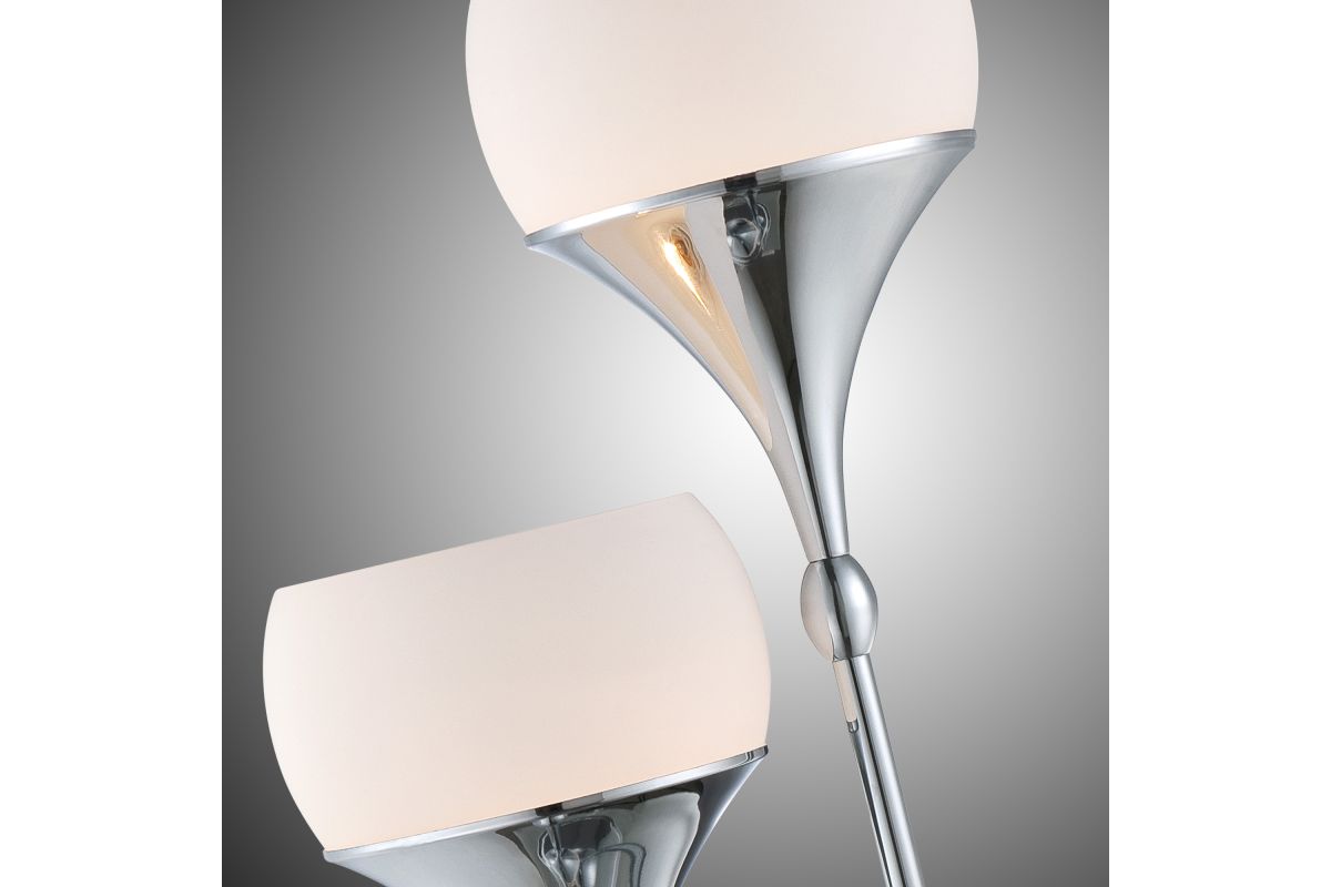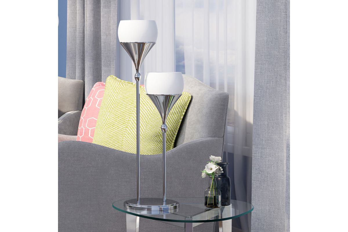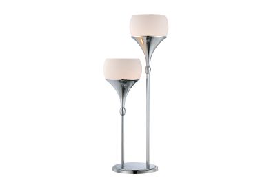 The Celestel Table Lamp features a sleek polished chrome base supporting two frosted glass shades, each housing a 13W CFL bulb. Standing at approximately 30.75 inches tall, this lamp offers a contemporary silhouette suitable for modern interiors. Its upward-facing design provides uplighting, creating a warm and inviting ambiance. Perfect for living rooms, bedrooms, or entryways, the Celestel lamp combines style and functionality, making it a versatile addition to any space.
