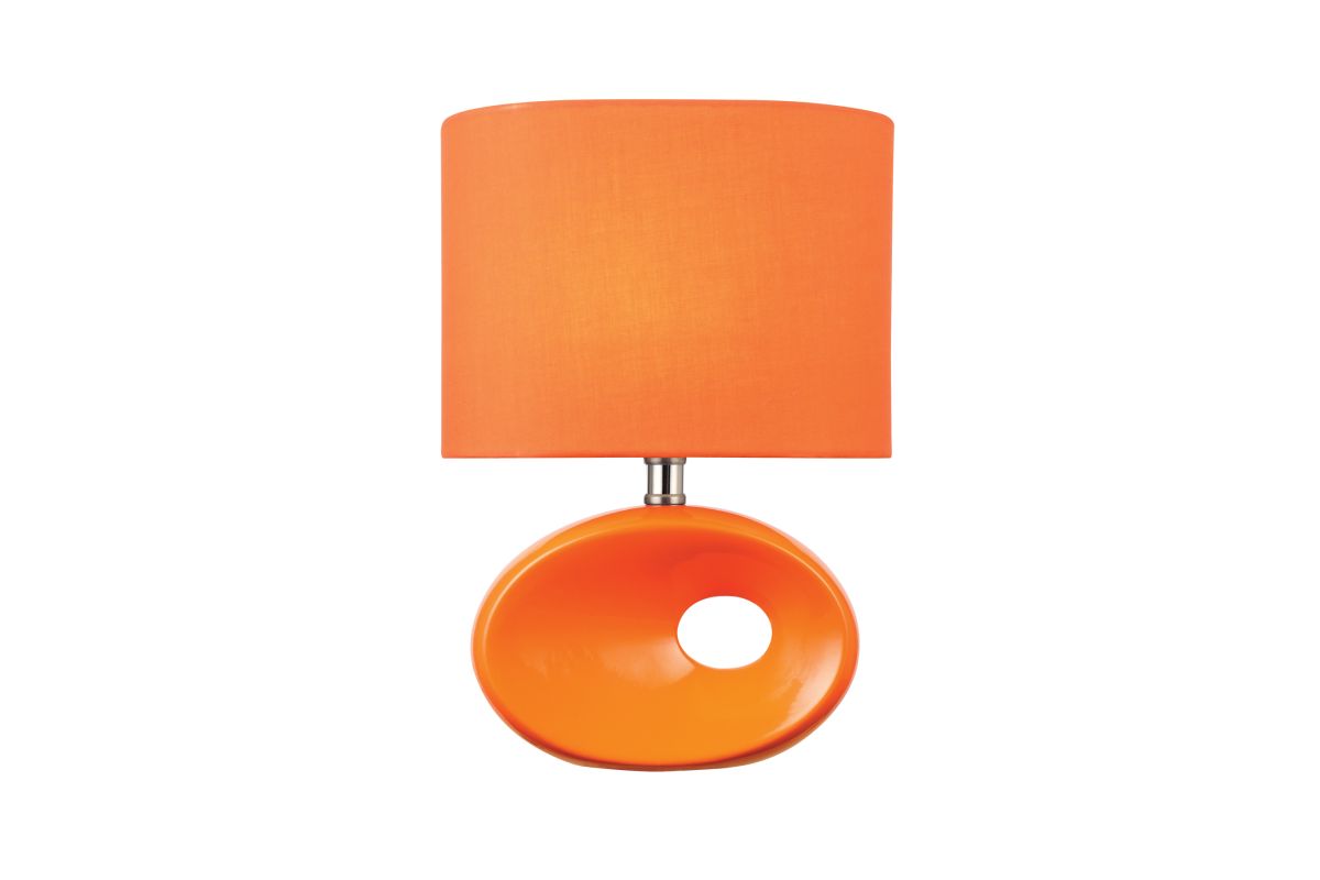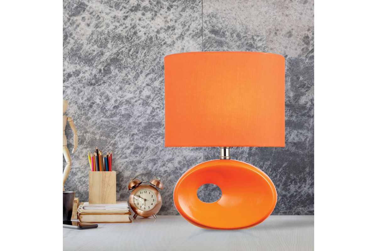 The Lite Source Hennessy II Table Lamp features a vibrant orange ceramic base with a matching elliptical fabric shade, creating a cohesive and bold statement piece. Standing at approximately 13 inches tall, it is designed to accommodate a 60W E27 bulb, providing ample illumination. This lamp's compact size and striking color make it an ideal accent for bedside tables, desks, or children's rooms, adding a touch of contemporary flair to any space.