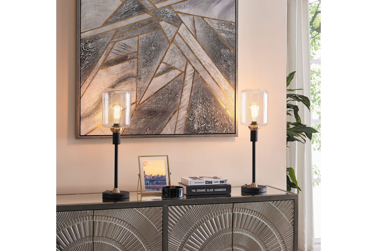 Double the style with this set of two modern industrial table lamps. Each lamp features a clear rectangular glass shade, paired with a black and antique brass base for a striking contrast. The exposed Edison-style bulbs add a vintage touch, while the slender profile makes them ideal for compact spaces like nightstands, desks, or console tables. Whether used together or separately, these lamps bring balanced elegance and a warm, ambient glow to any room.