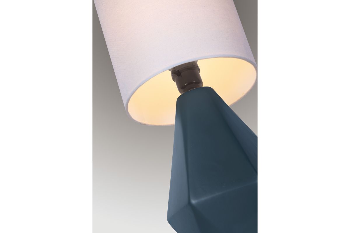 The Lite Source LS-23204BLK Mason Table Lamp features a geometric ceramic base in various finishes, complemented by a white linen drum shade. Standing at 17 inches tall with a 7-inch diameter, this lamp is designed to add a pop of color and modern flair to any space. It accommodates a 60W E27 bulb (not included) and includes an on/off push button switch for convenience. Its compact size makes it ideal for bedside tables, desks, or accent areas, enhancing both functionality and style in your home or office.