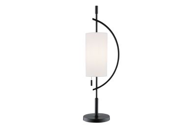 Add artistic sophistication to your space with this modern arc table lamp. Featuring a striking black metal frame that curves gracefully around a cylindrical white fabric shade, this lamp is a statement in balance and form. Its clean lines and unique silhouette make it perfect for contemporary living rooms, bedrooms, or office desks. With ambient lighting and sculptural presence, it blends function with elevated design.