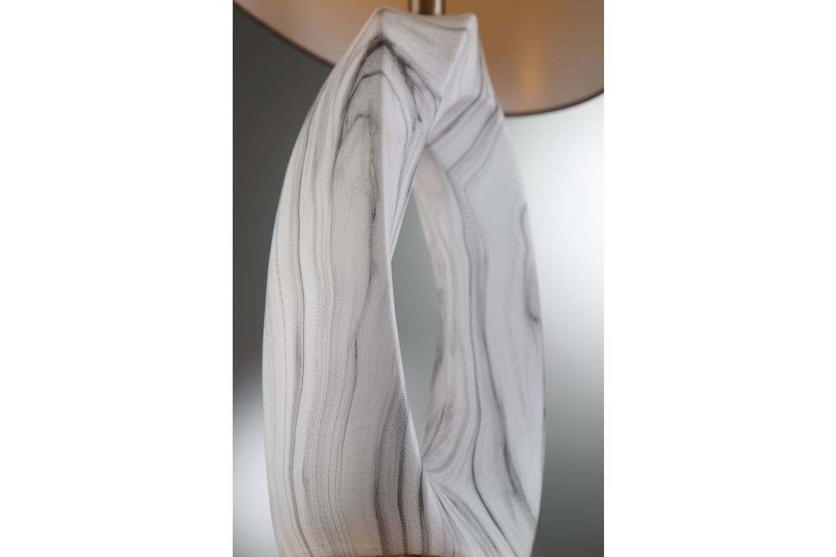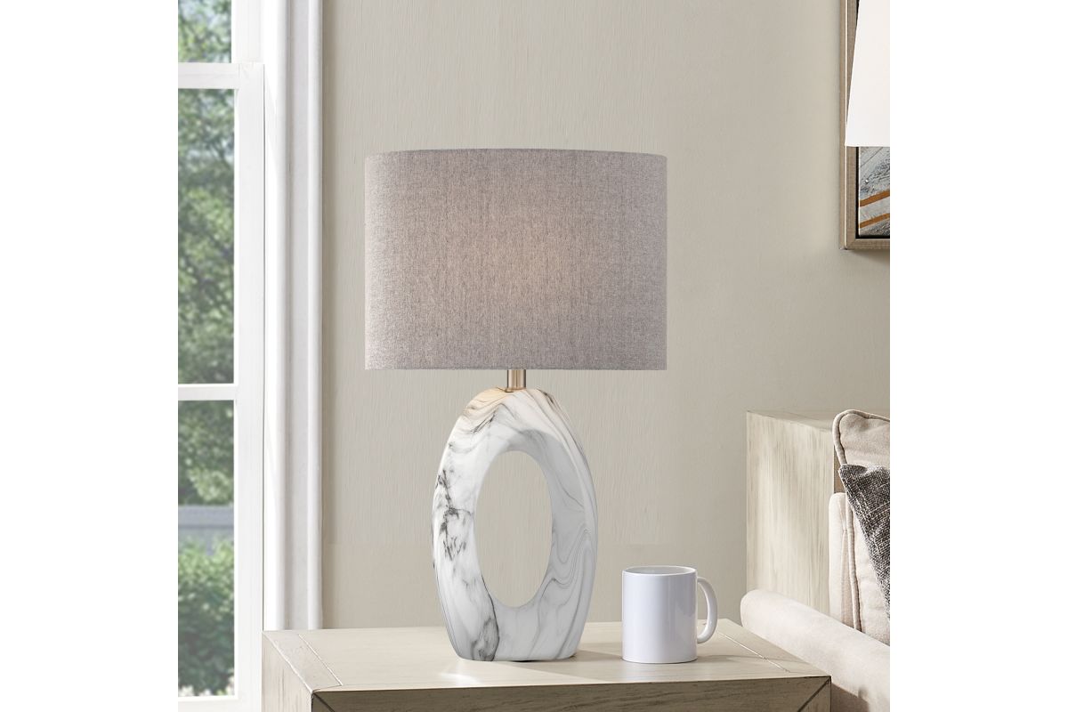 Made of white faux marble with subtle black veins, this contemporary table lamp comes in a decorative ceramic base and a beautiful gray linen fabric oval shade. Create a gallery-inspired look in a bedroom or living space with this stylish lamp.