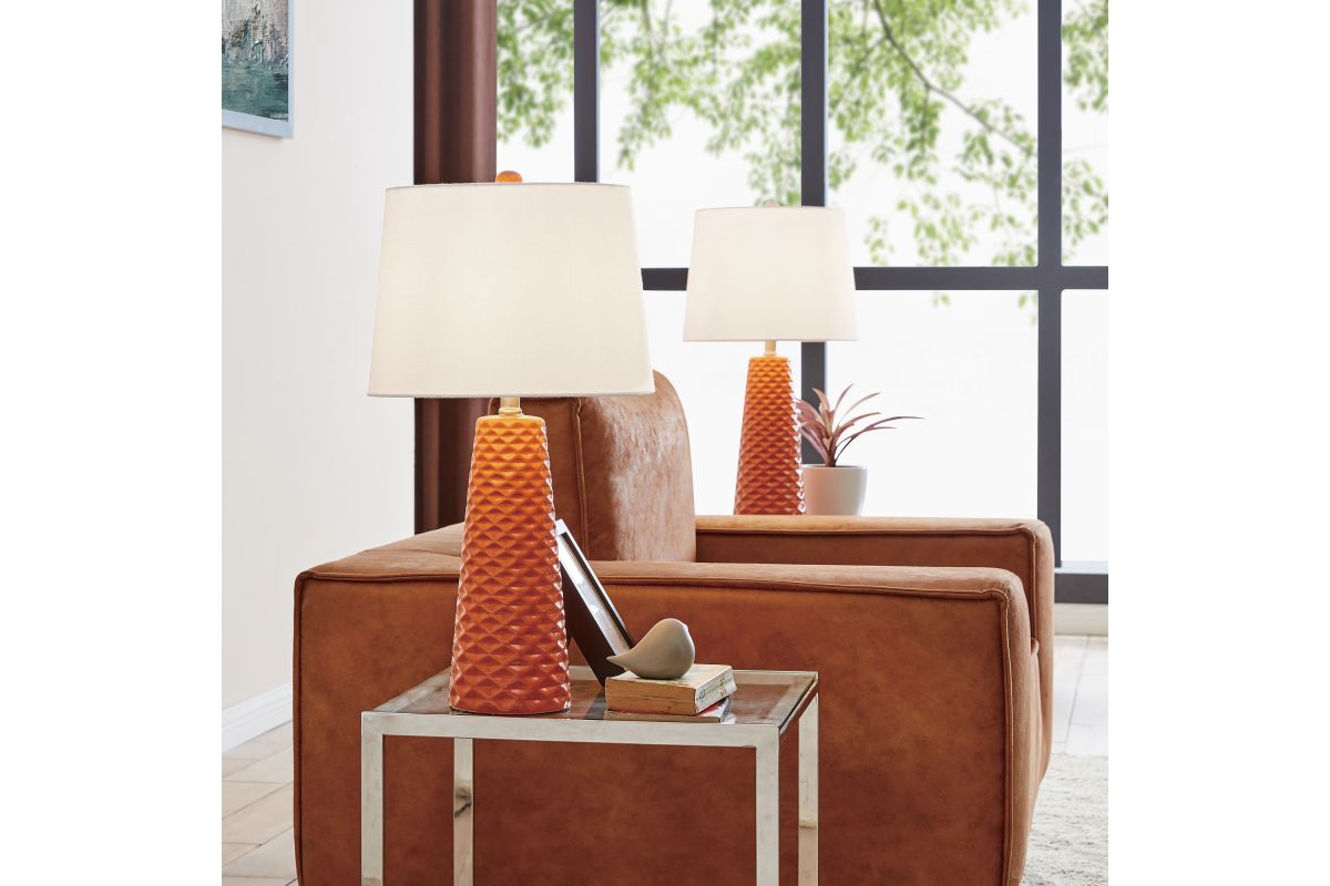 Add a splash of color and personality to your home décor with this cheerful 2-pack of ceramic table lamps. Featuring a stylish cone-shaped base with a quilted texture, these lamps come in vivid lime green and bright orange finishes, perfect for modern, eclectic, or retro-inspired interiors. Topped with crisp white drum shades, they provide the perfect balance of function and fun.