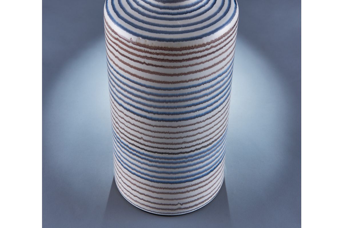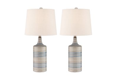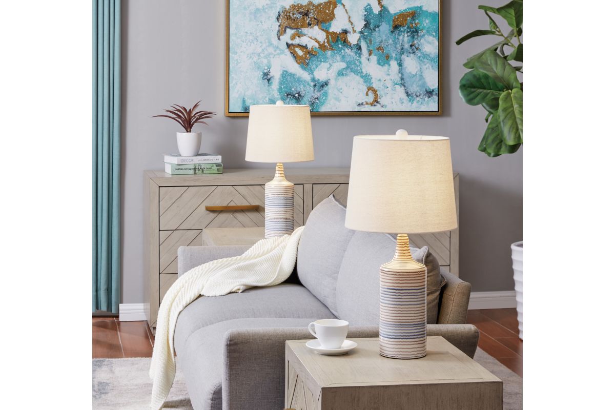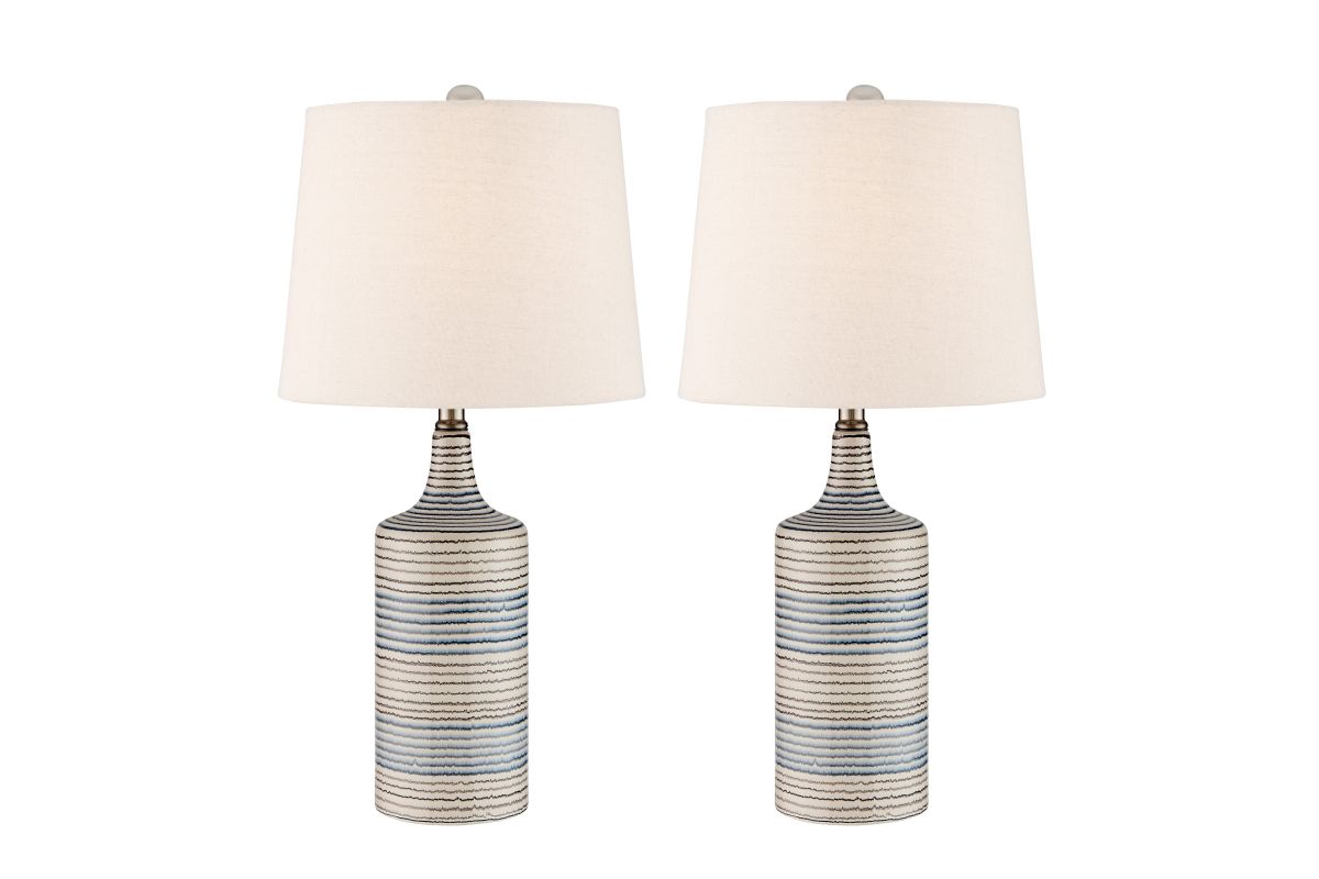 Add a touch of coastal charm and contemporary elegance with this set of two ceramic table lamps. Featuring a vertically ribbed body wrapped in hand-painted horizontal stripes in soothing blue, beige, and ivory tones, each lamp is topped with a classic tapered white fabric shade. These lamps offer a perfect blend of texture, color, and function—ideal for bedrooms, living rooms, or entryways seeking a relaxed yet refined look.