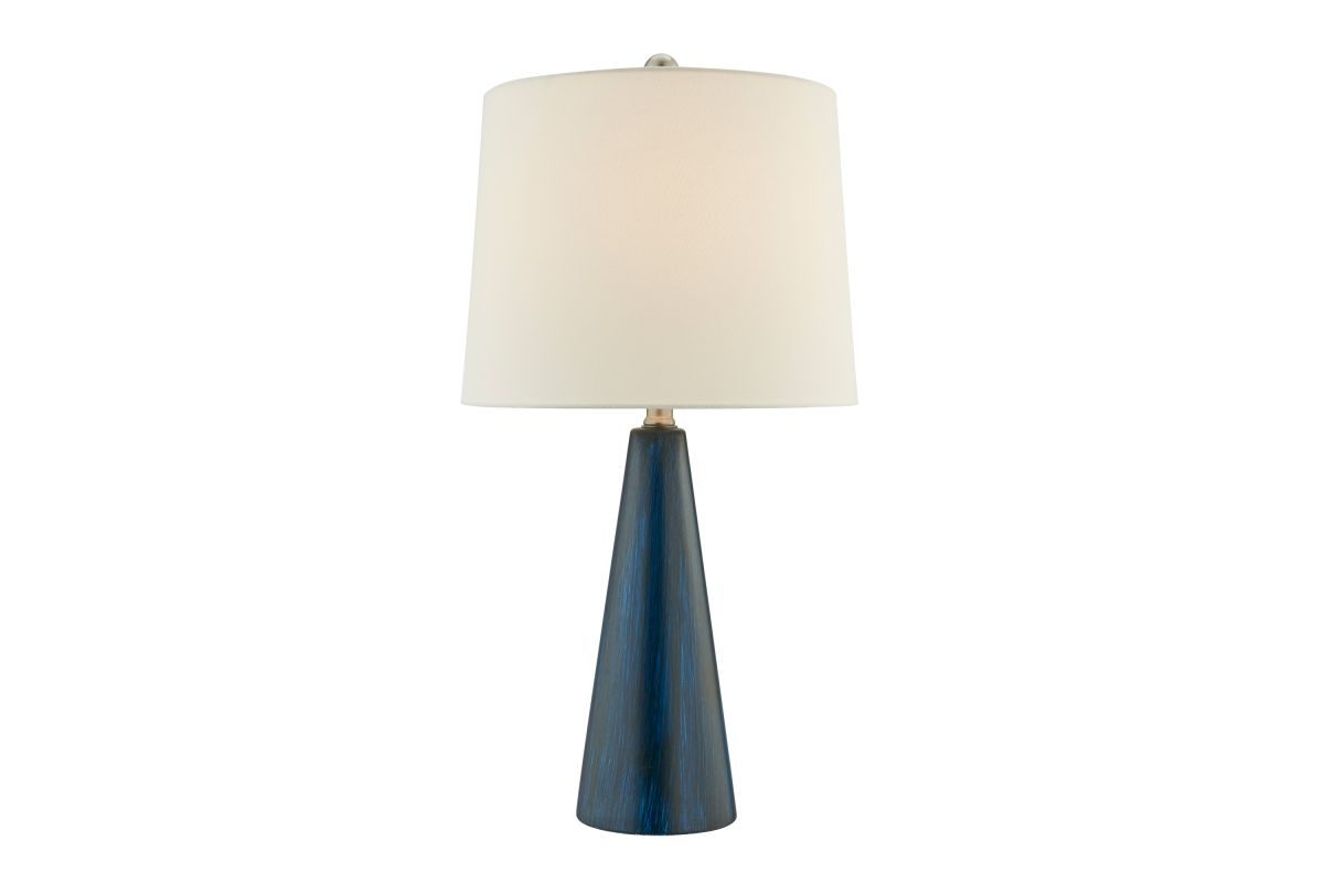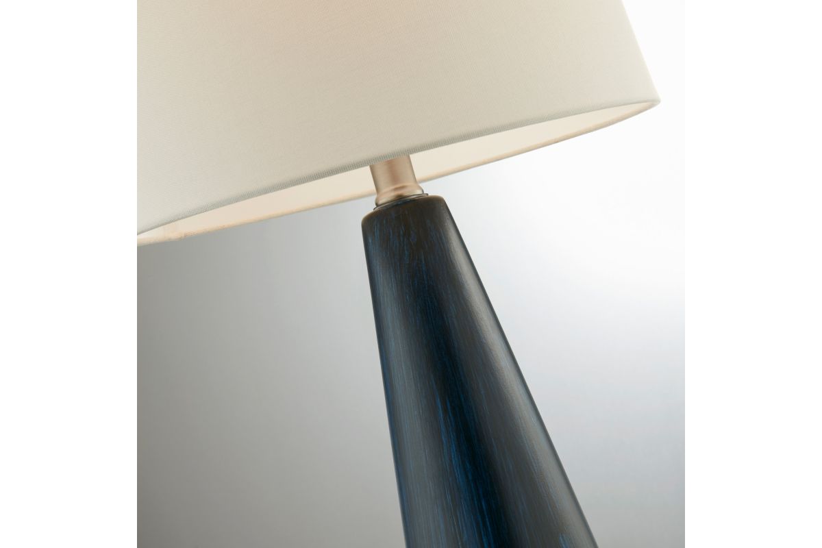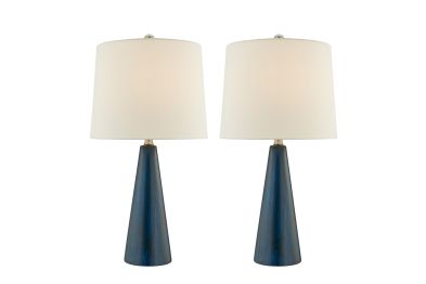 This set of two blue ceramic table lamps offers a refreshing look for modern or coastal style decorating. Each lamp features a hand-crafted water-flow design that offers a natural elegant look. The design is topped by a white fabric tapered drum shade. An ideal look for a contemporary or coastal style room.