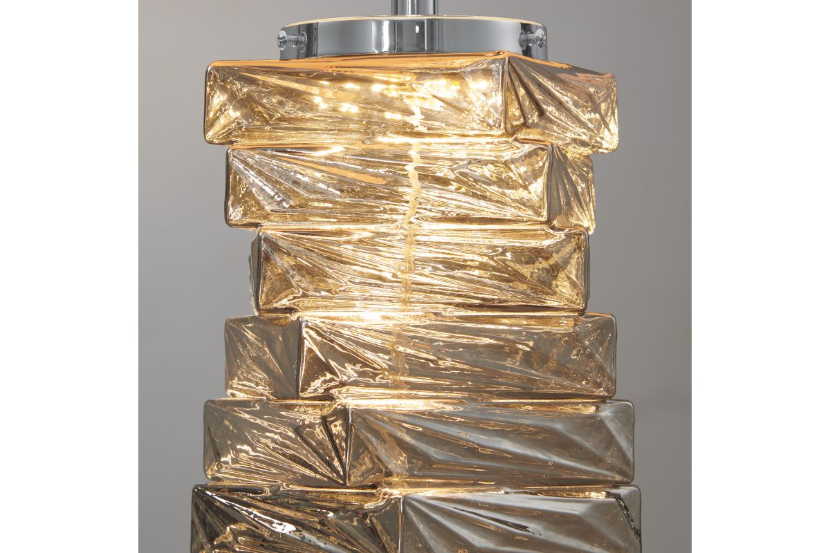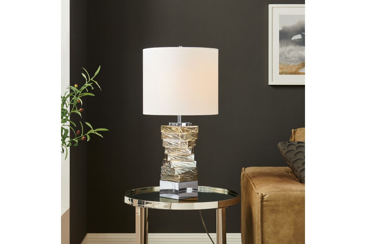 Introducing our sleek and stylish modern LED table lamp with an artistic look of elegant simplicity. This energy-efficient lamp is made up of a spiral silhouette with a body fashioned in a smoked stacked glass accent and a polished chrome metal base. The lamp comes with a 3-level switch. You can choose to turn on the top light, lamp body light, or both on at the same time. Polished chrome metal construction and a tall white fabric drum shade complete the look.