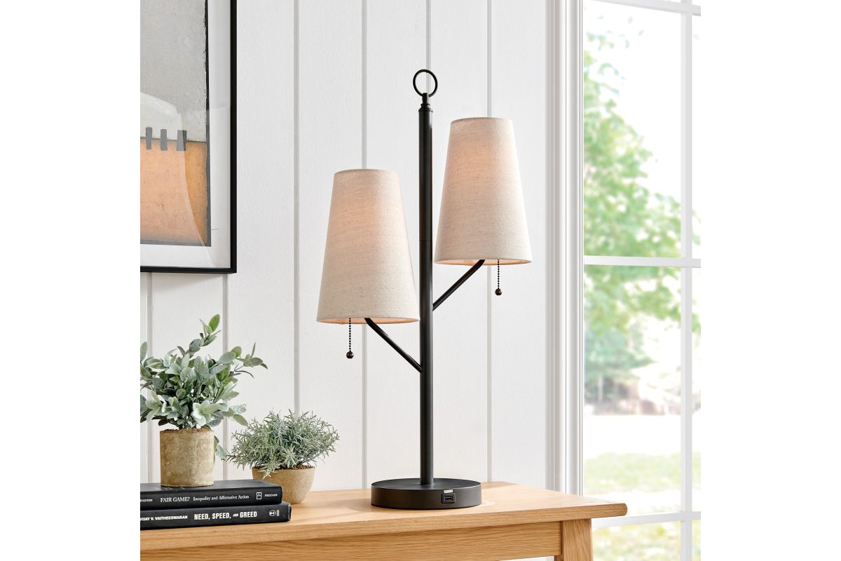 Introducing the stunning transitional style 2-light table lamp, a masterful blend of classic and contemporary design. The lamp is expertly crafted with a rich dark bronze finish in metal, adding a touch of sophistication to any room. The shades are perfectly balanced on each side, creating a harmonious and elegant look. The slim linen tapper shades diffuse light beautifully, lending a warm and inviting feel to your space. The dual pull-chain switches allow for effortless light control. This lamp is perfect for adding a touch of refinement to your living room, bedroom, or study, a true testament to your impeccable taste.