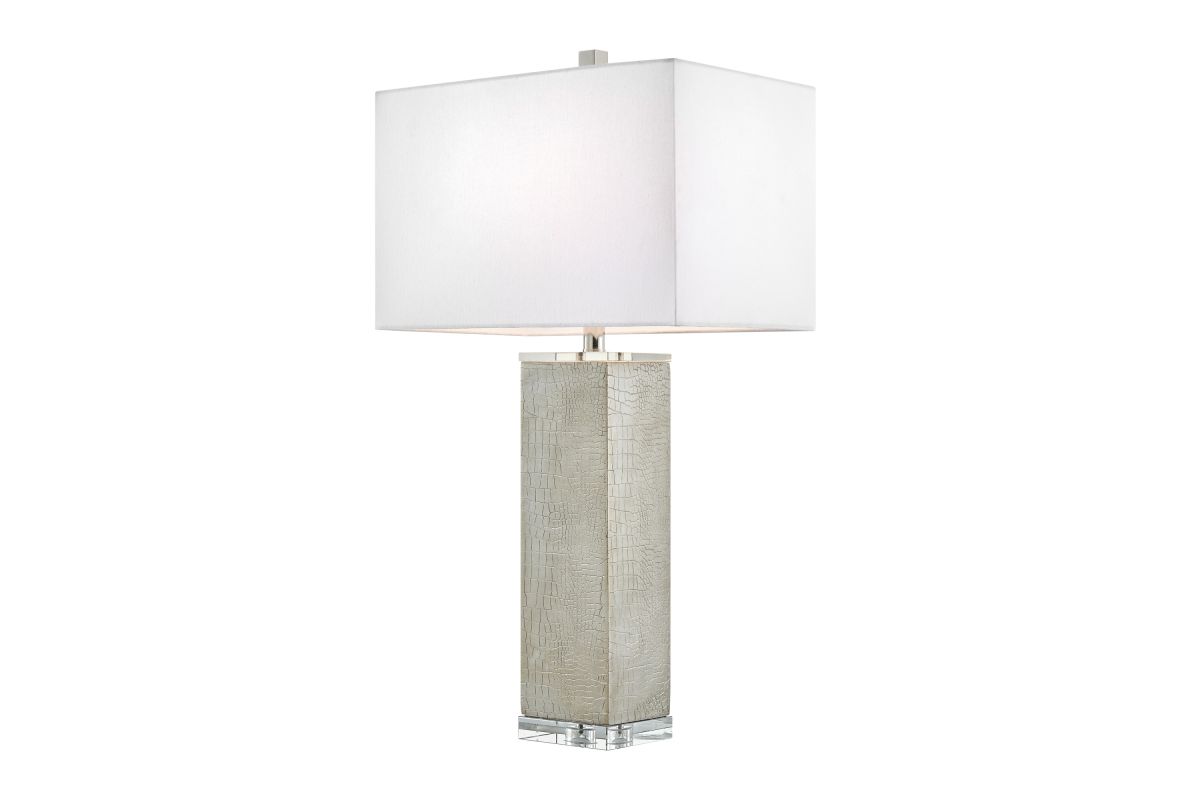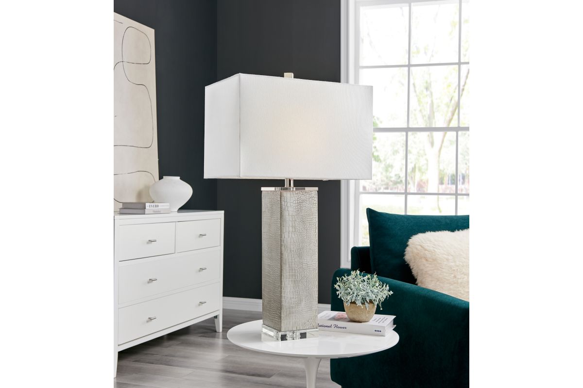Elevate your contemporary decor with our stunning 30" table lamp. Its exquisite champagne silver finish, adorned with a crocodile skin motif in cast resin construction, adds a touch of modern luxury to your space. The lamp boasts a heavy crystal base and accent piece that sparkles with sophistication, enhancing any room's ambiance. Topped with a crisp white rectangle fabric shade, it emits a soft and elegant glow, creating a captivating focal point in your interior design. Illuminate your space with the chic and glamorous charm of this champagne silver table lamp.
