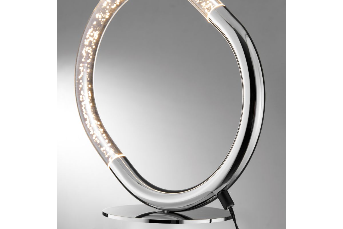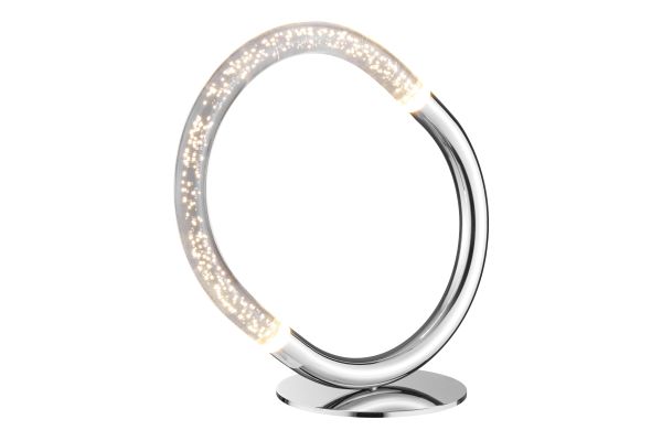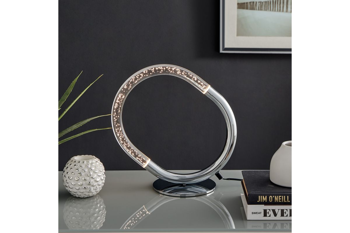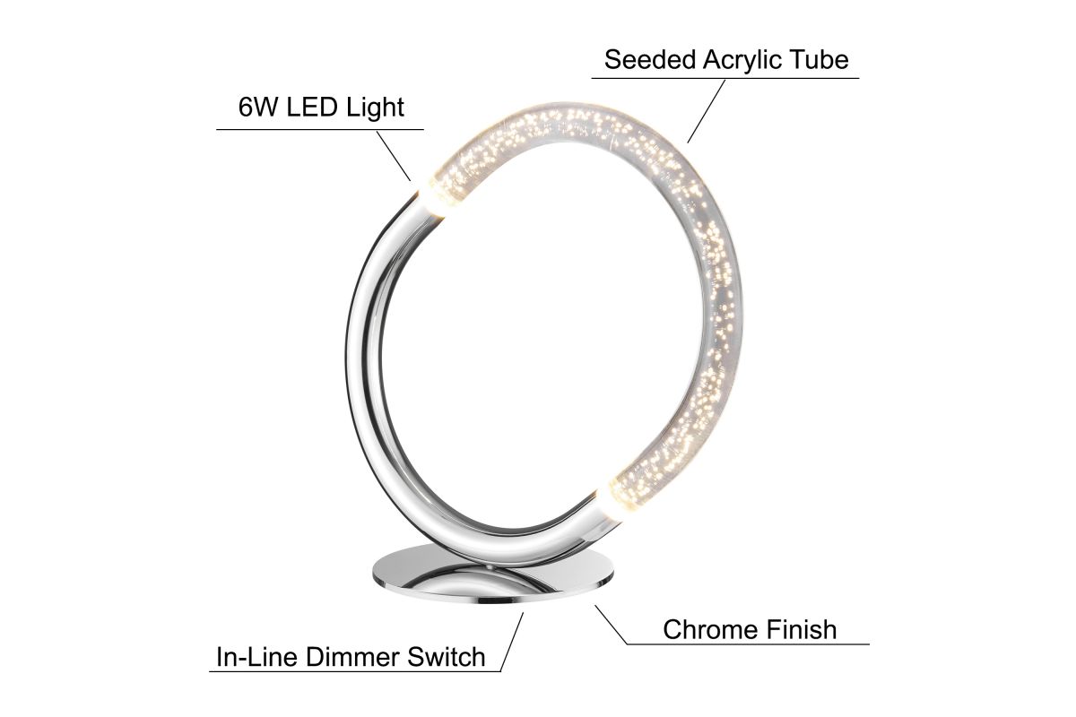 Experience the fusion of fine art and ambient lighting with this exquisite modern LED accent table lamp. Designed to infuse a dynamic touch into contemporary spaces, this energy-efficient lamp offers a captivating aesthetic through its sparkling silhouette. Crafted with precision, it boasts a sleek polished chrome finish on a sturdy metal frame, housing a mesmerizing 6-watt crystal acrylic tube with a captivating bubble effect. Conveniently equipped with an in-line dimmer switch, this lamp provides variable lighting levels to cater to your unique preferences and needs. Illuminate your surroundings with this stunning blend of form and function.