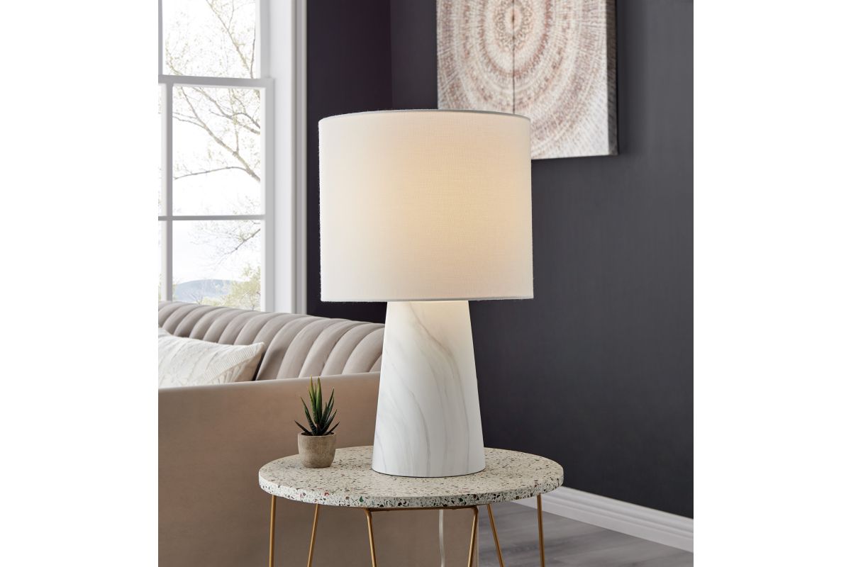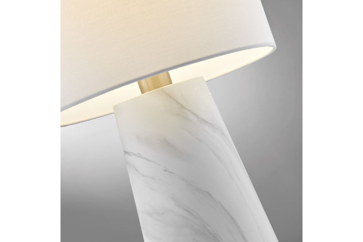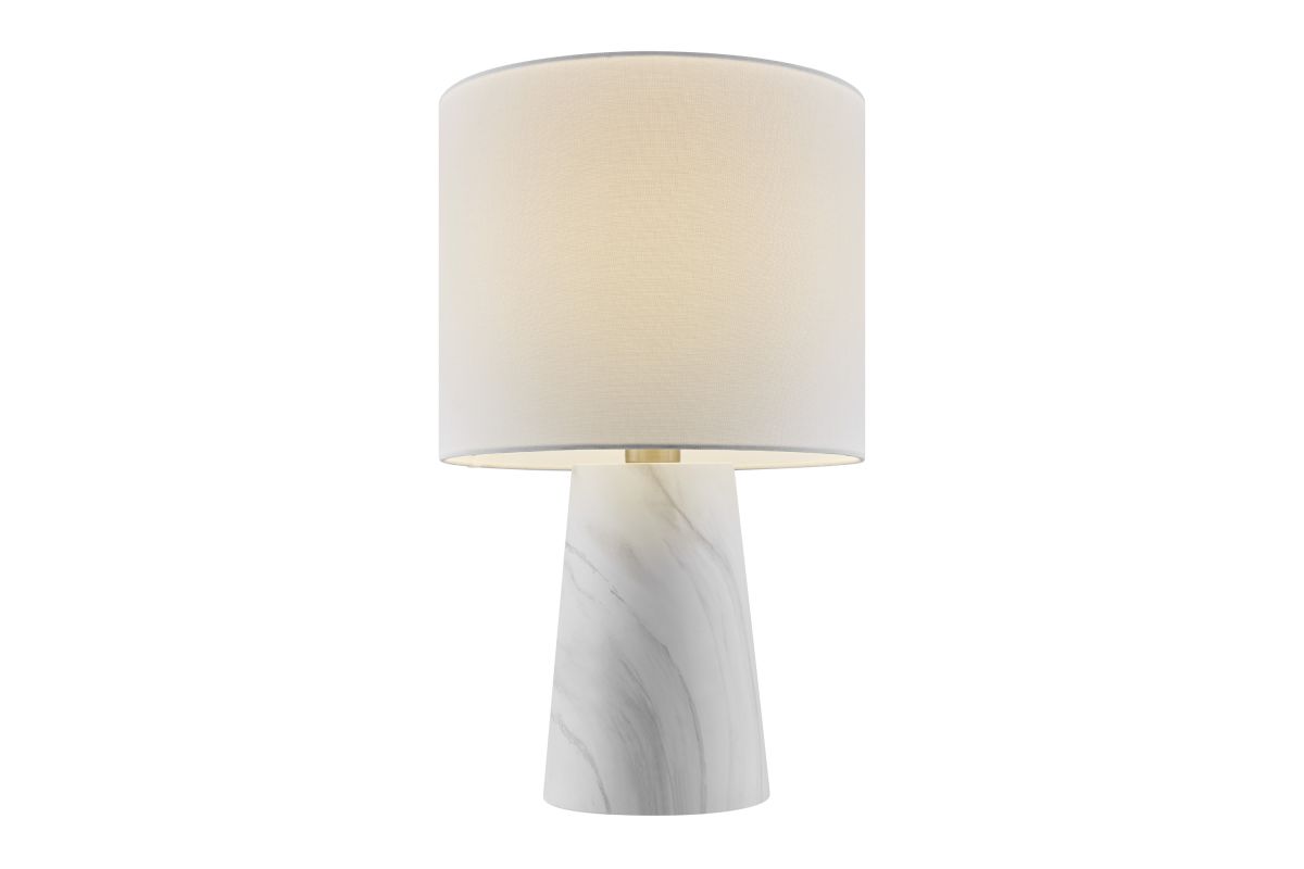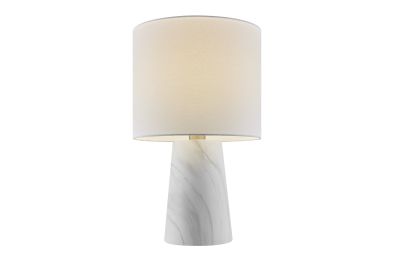 Elevate your decor with the contemporary allure of this faux marble table lamp. Its eye-catching design showcases a free-form marble pattern meticulously crafted from cast resin, offering a striking yet naturally elegant appearance. The lamp is complemented by an off-white tall drum fabric shade, providing soft and gentle illumination that beautifully enhances any modern decor.
