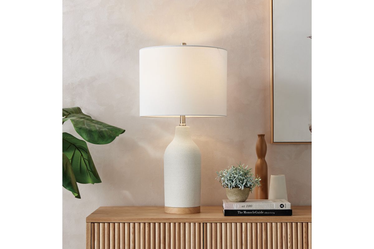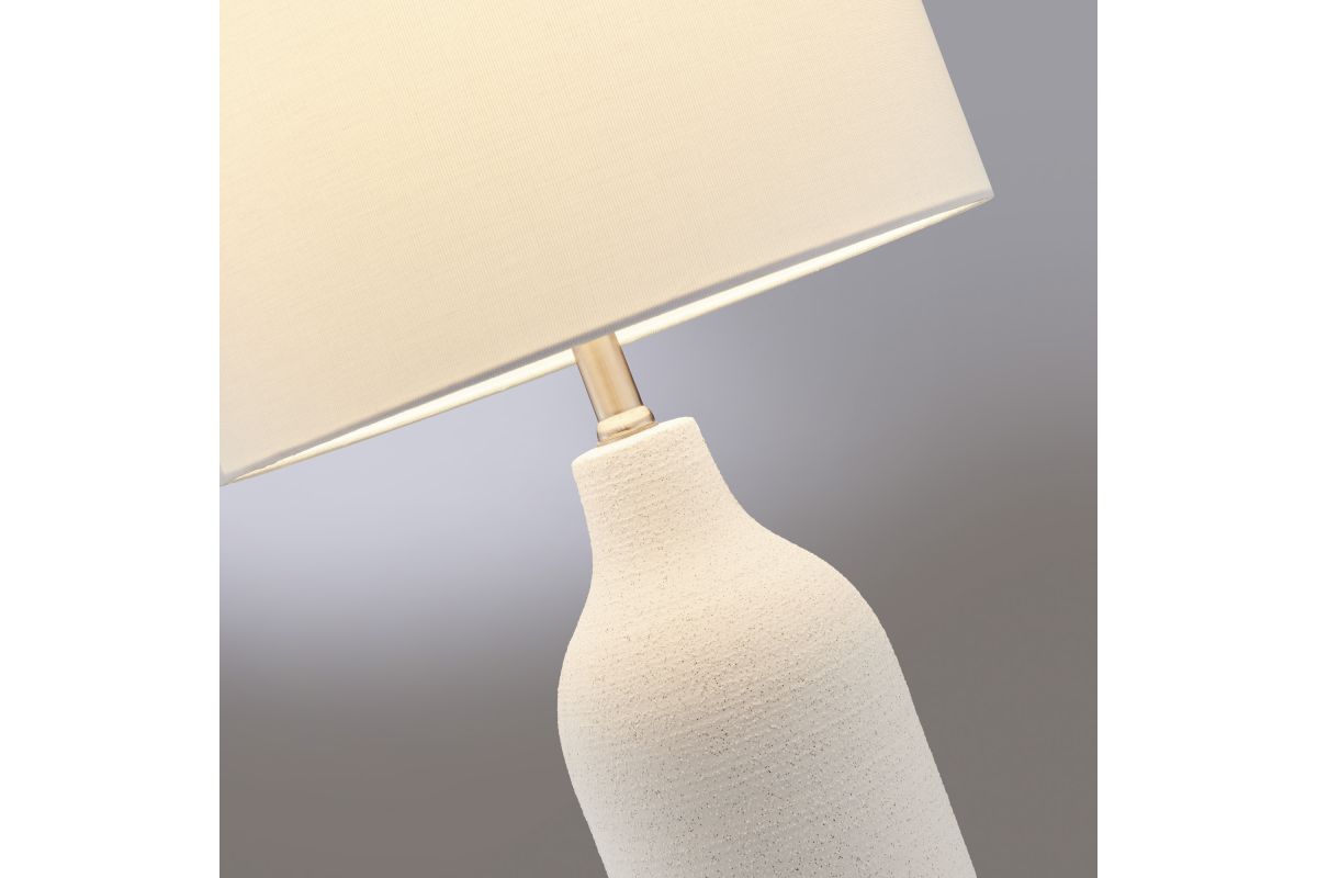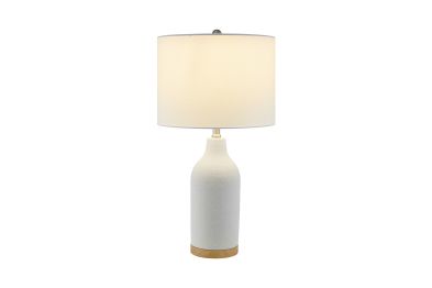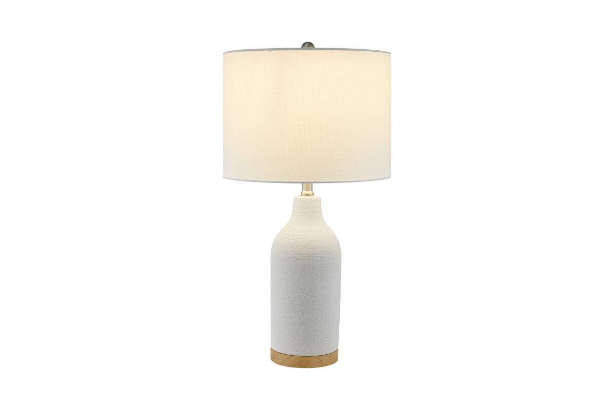 Elevate your decor with a tasteful tribute to retro style through this textured white ceramic table lamp. Drawing inspiration from the clean lines and Mid-Century aesthetics, this modern table lamp seamlessly blends wood and ceramic materials. The ceramic body boasts a textured sand surface, harmonizing beautifully with the natural wood base. To crown this exquisite piece, an off-white fabric drum shade completes the look, adding a touch of timeless elegance.