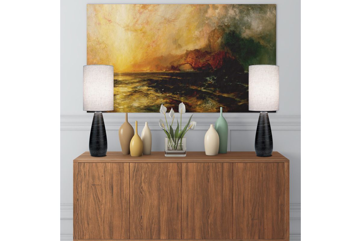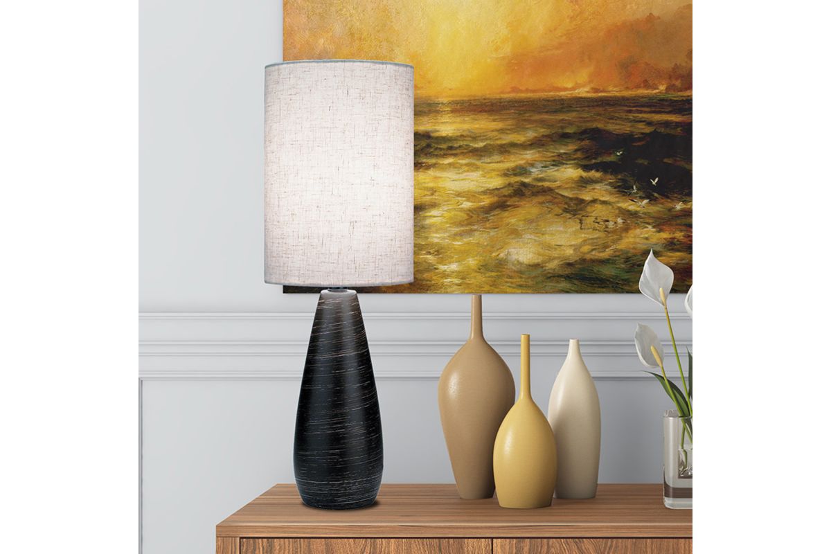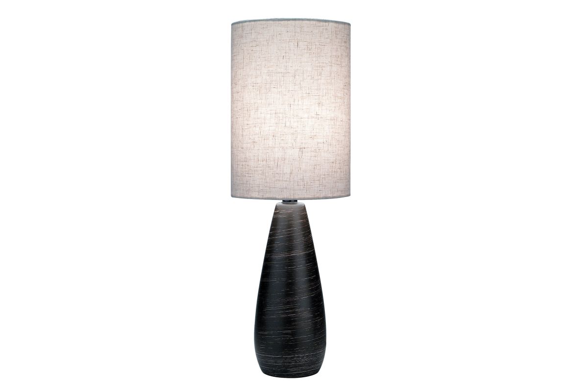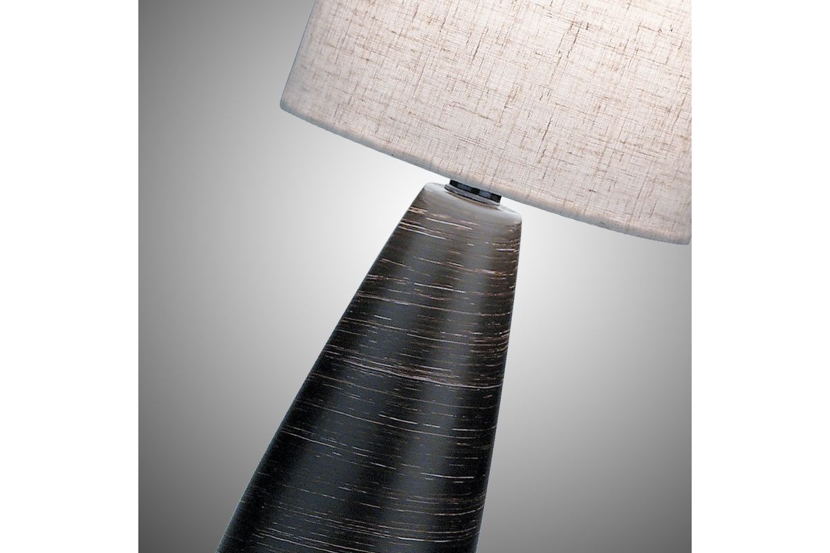 Sleek, contemporary design featuring an elegant, vase-like ceramic base with a subtly tapered, fluid silhouette. The base appears finished in a dark, brushed bronze/taupe hue. Simple cylindrical shade in a linen-like fabric, neutral in tone (off-white or beige). It complements the base and offers a clean, modern look.