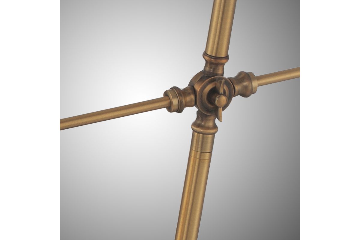 The Lite Source LS-82605 Cupola Floor Lamp features a sleek brushed brass finish over a metal frame, standing approximately 59 inches tall, 39 inches wide, and 11 inches deep. It includes two 100W E27 A-type bulbs (included) and operates via a rotary on/off switch. The lamp's design combines modern elegance with functional lighting, making it suitable for various interior styles.