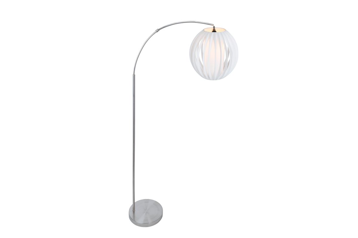The Lite Source LS-82957 Deion Arc Floor Lamp features a sleek brushed nickel finish over a metal frame, standing approximately 79.5 inches tall, 28.5 inches deep, and 15 inches wide. It includes a 42W E27 CFL bulb (included) and operates via a rotary on/off switch. The lamp's design combines modern elegance with functional lighting, making it suitable for various interior styles.