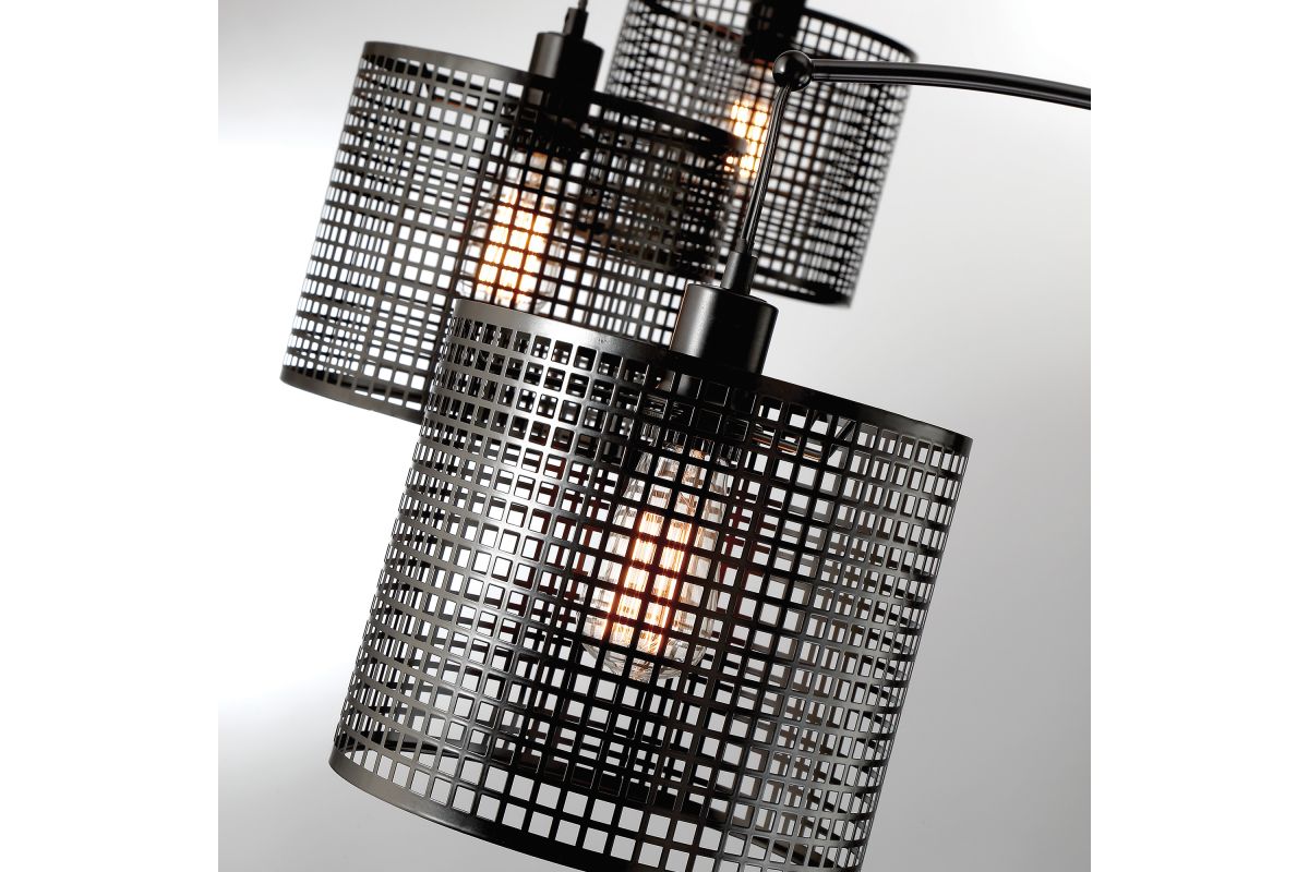Make a bold statement with this industrial-style arc floor lamp featuring three mesh drum shades suspended from a sleek arched frame. The matte black finish and exposed bulb design add a modern, edgy touch, while the triple-light setup provides ample illumination for living rooms, reading nooks, or office spaces. A sturdy round base ensures stability, and the adjustable arc allows for tailored lighting coverage.