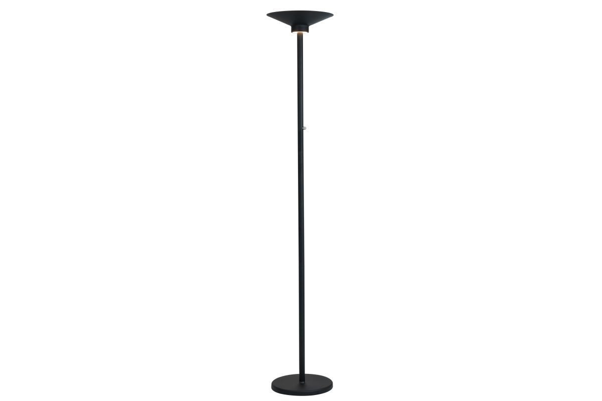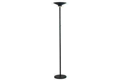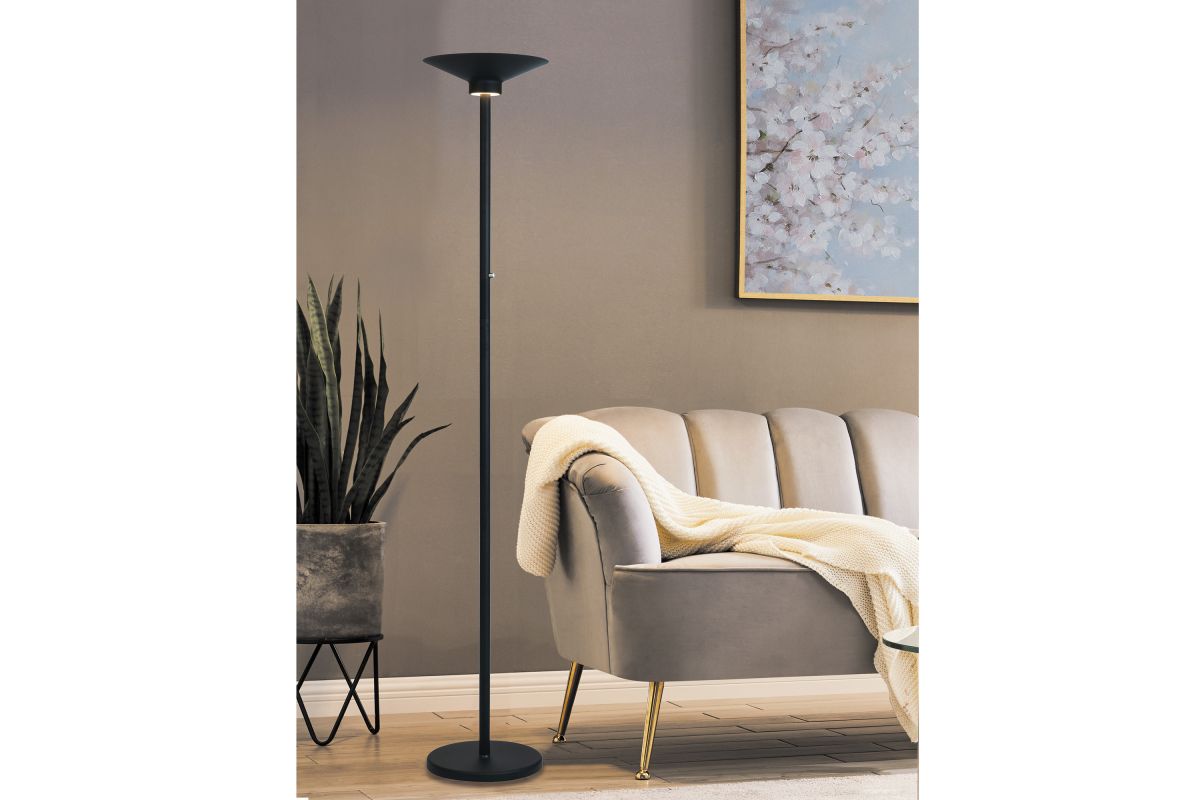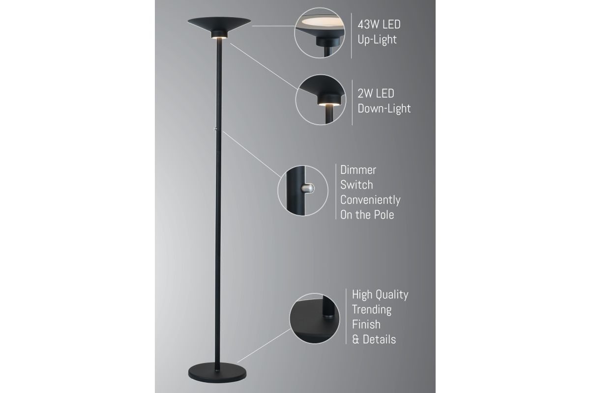 The Lite Source LS-83303BLK Sappho Floor Lamp features a sleek black finish over a metal frame, standing approximately 72 inches tall, 12.5 inches wide, and 12.5 inches deep. It includes two integrated LED bulbs: a 43W LED panel and a 2W LED accent light, providing both ambient and task lighting. The lamp's design combines modern elegance with functional lighting, making it suitable for various interior styles.