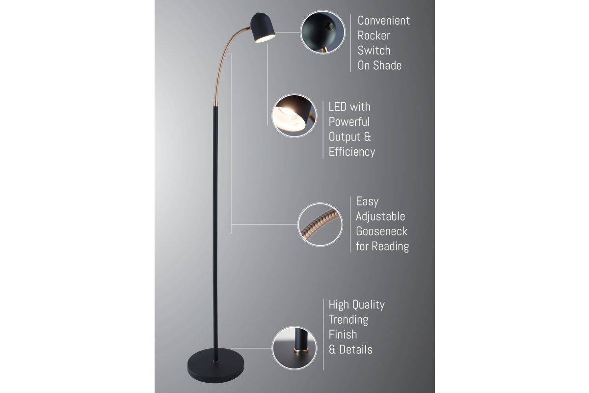 Sleek and understated, this matte black gooseneck floor lamp is the perfect lighting solution for modern interiors. Its clean silhouette and fully adjustable neck provide targeted illumination for reading, working, or relaxing. The slim base easily tucks beside furniture, while the black finish adds bold contrast to neutral or colorful rooms alike. Ideal for home offices, reading corners, or minimalist living spaces.