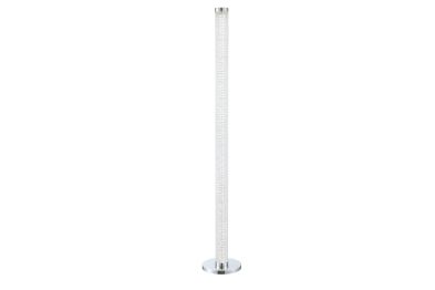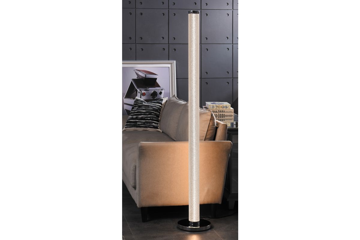 A cylindrical silhouette flatters this chrome and diamond LED touch floor lamp. A nostalgic retro icon is repurposed into ambient room lighting as this modern LED floor lamp offers an artistic look of elegant simplicity. This energy-efficient lamp from the Quilla collection by Lite Source rests on a cylindrical silhouette with a body fashioned of diamond acrylic and a base made of polished chrome finish metal. A touch-dimmer switch on the top of the lamp allows for variable lighting levels suited to specific purposes. The floor lamps comes with built- in dimmable 20 watt LED module. LED 1920 lumen light output, comparable to a 100 watt incandescent. 3000K color temperature.