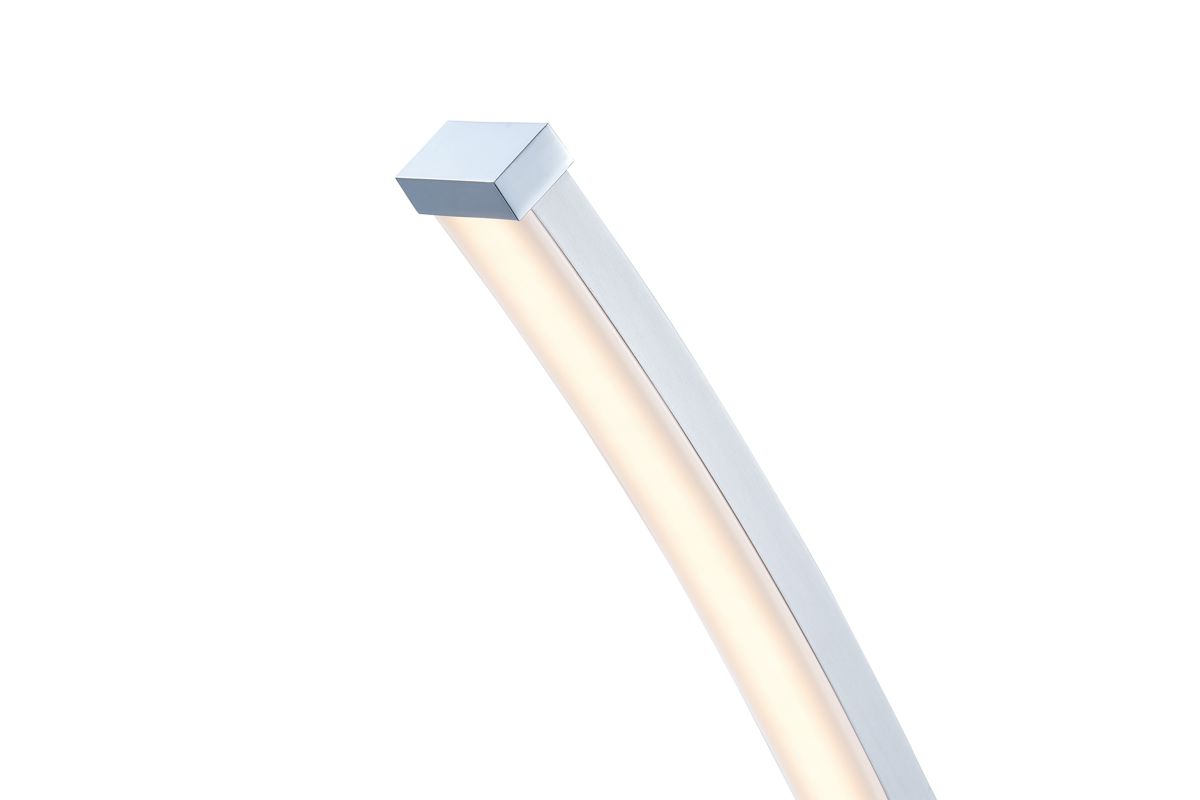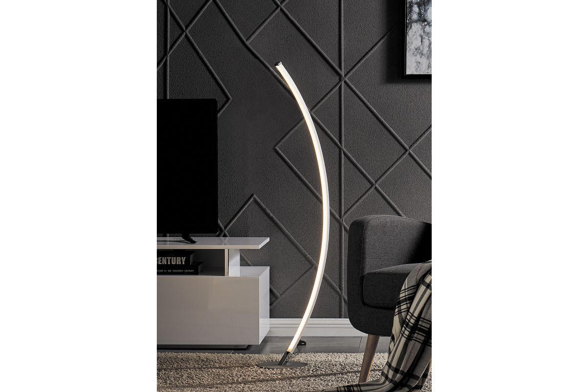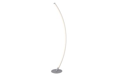 Despite its minimalist design, the bright LED floor lamp will be the focal point of any space. It features a metallic finish over metal construction, topped by an aluminum and acrylic diffuser, but the prominent feature is its sleek, curved, wispy-thin silhouette. A foot switch provides 4-way dimming lighting control. It's an eye-catching design that looks great in a modern office space or a home entertainment room.