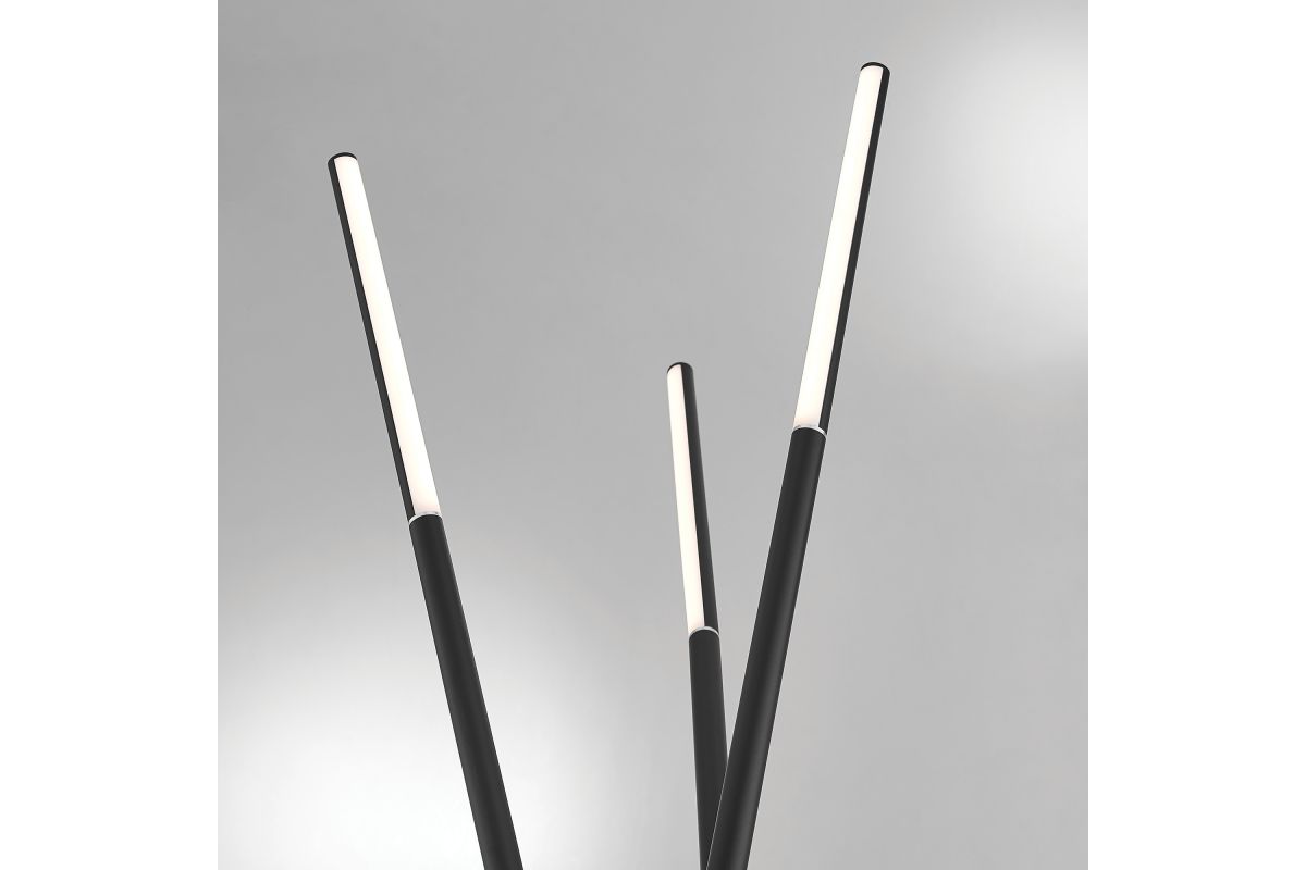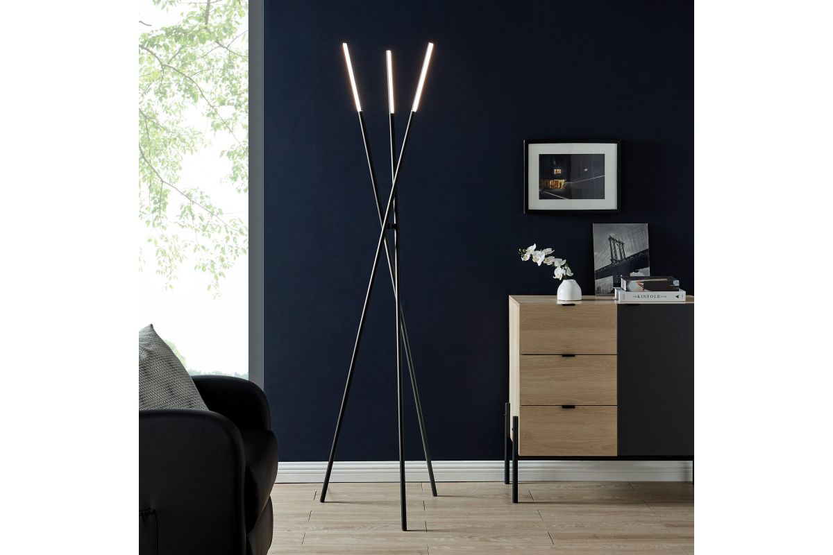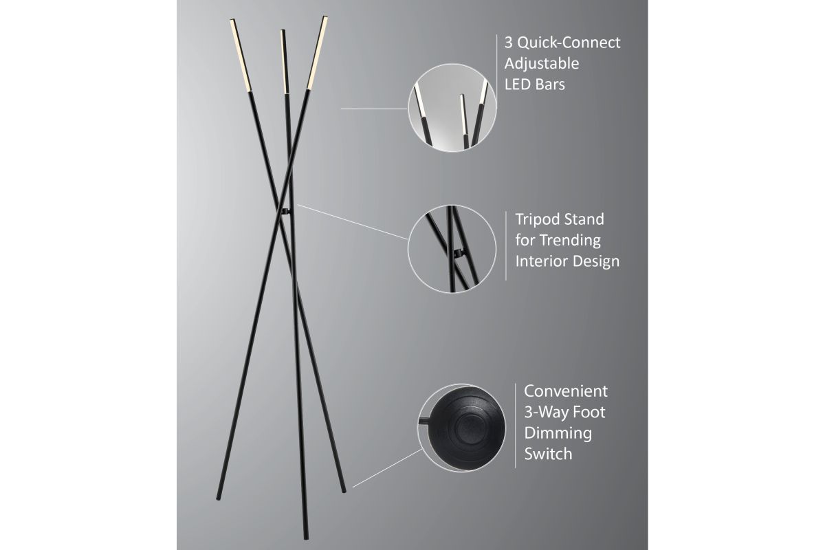 Despite its minimalist design, the bright 3-lights LED tripod floor lamp will be the focal point of any space. It features a metallic finish over metal construction, topped by an aluminum and acrylic diffusers, but the prominent feature is its sleek and wispy-thin silhouette. Convenient foot switch provides 4-way dimming lighting control. It's an eye-catching design that looks great in a modern living space or a home entertainment room.