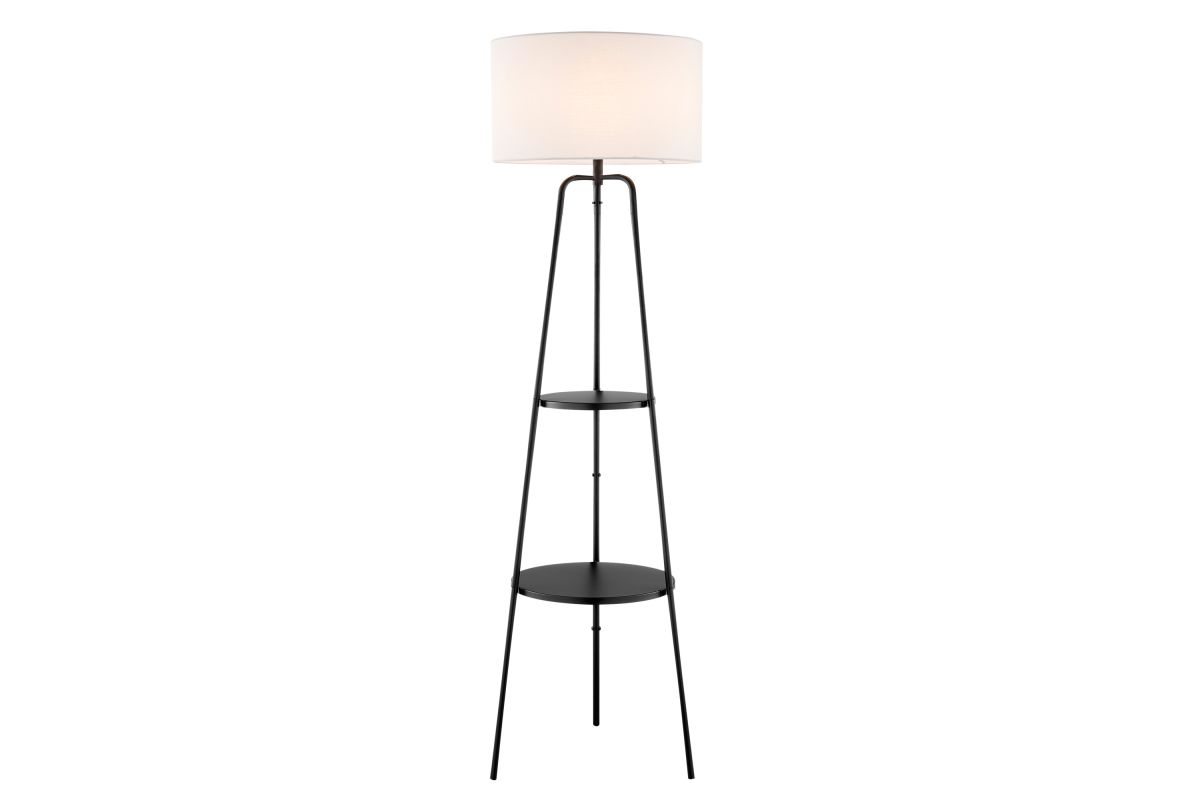 Elevate your home lighting with this floor lamp that doubles as a storage solution. Featuring a sleek black metal frame with two round shelves, this lamp adds both form and function to your space. The white linen drum shade offers a soft, ambient glow—perfect for cozy reading corners, living rooms, or bedrooms.