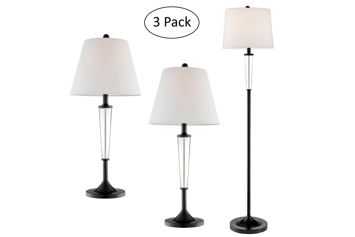 Elevate your home’s ambiance with this elegant 3-pack lamp set, including two matching table lamps and one floor lamp. Featuring a sleek black base with clear glass accent columns and classic white fabric shades, this set blends seamlessly with both traditional and contemporary interiors. Ideal for bedrooms, living rooms, or entryways, it provides balanced lighting and cohesive style across your home.