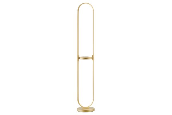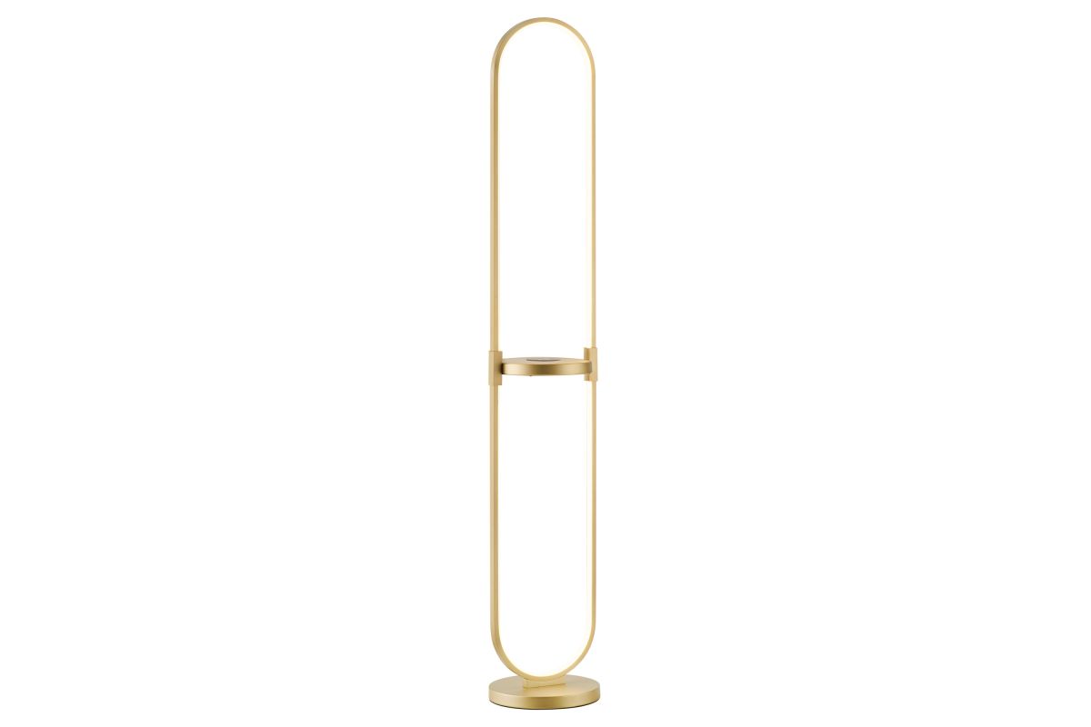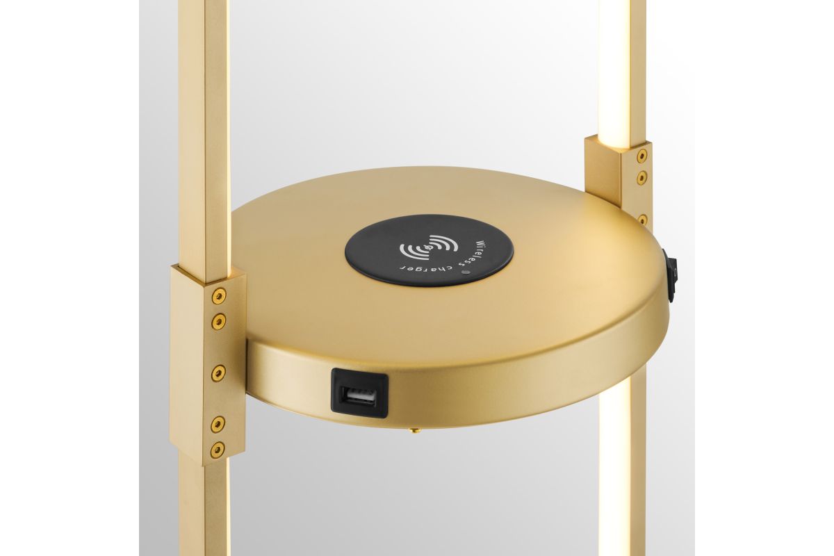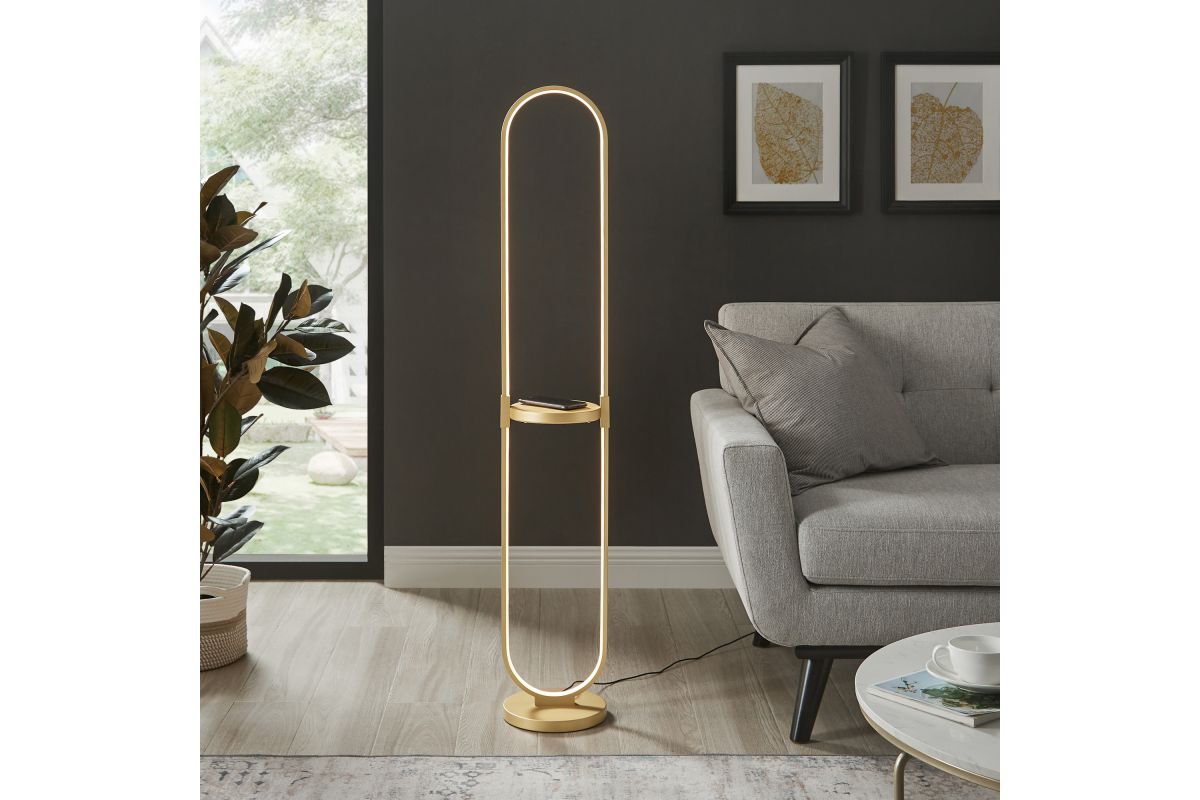 Combine two-in-one innovation with expert craftsmanship in this LED floor lamp with built-in wireless charging & USB tray table for your home. The lamp's open, loop-like silhouette captures attention and creates a striking focal point in any room. The inner edge of the ring is outfitted with an integrated LED light, radiating a bright and inviting glow throughout your space. Functional tray table in matching finish includes a built-in QI wireless charging pad and USB port, allowing you to fast charge compatible smart phone or other electronic device with ease. On/off rocker switch located on tray table provides easy lighting control. It's an eye-catching design that looks great in a modern living space or a home entertainment room.
