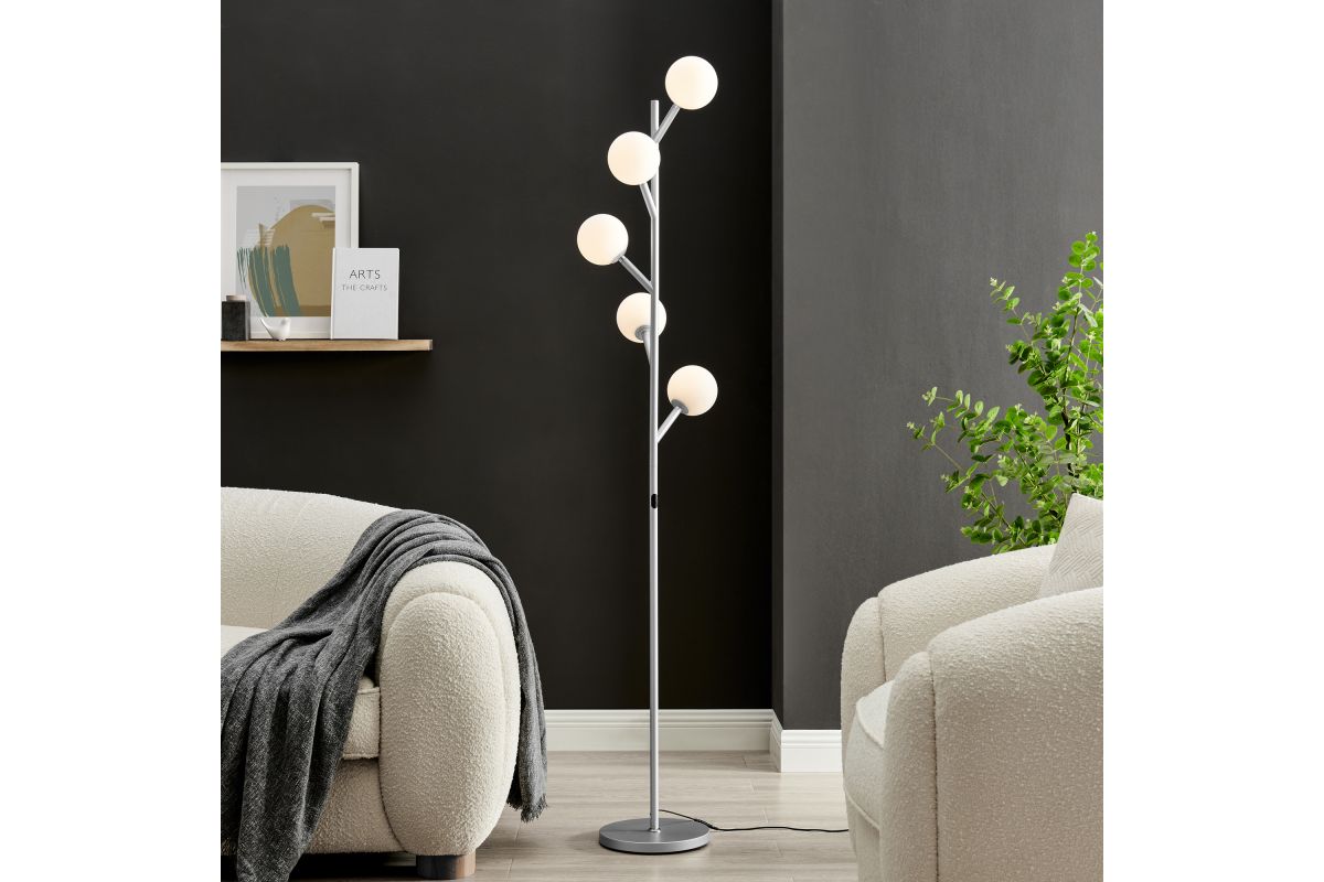 Subtlety works wonders to embellish a modern space, and this LED tree floor lamp accomplishes a tribute to simple style. This floor focuses on a slender silhouette in a tree design with five LED frosted glass orb glows brightly. The super-bright LED lights provide ample illumination, while the cool-looking design makes a bold statement. The lamp offers pole-based one touch 4-way dimming switch.