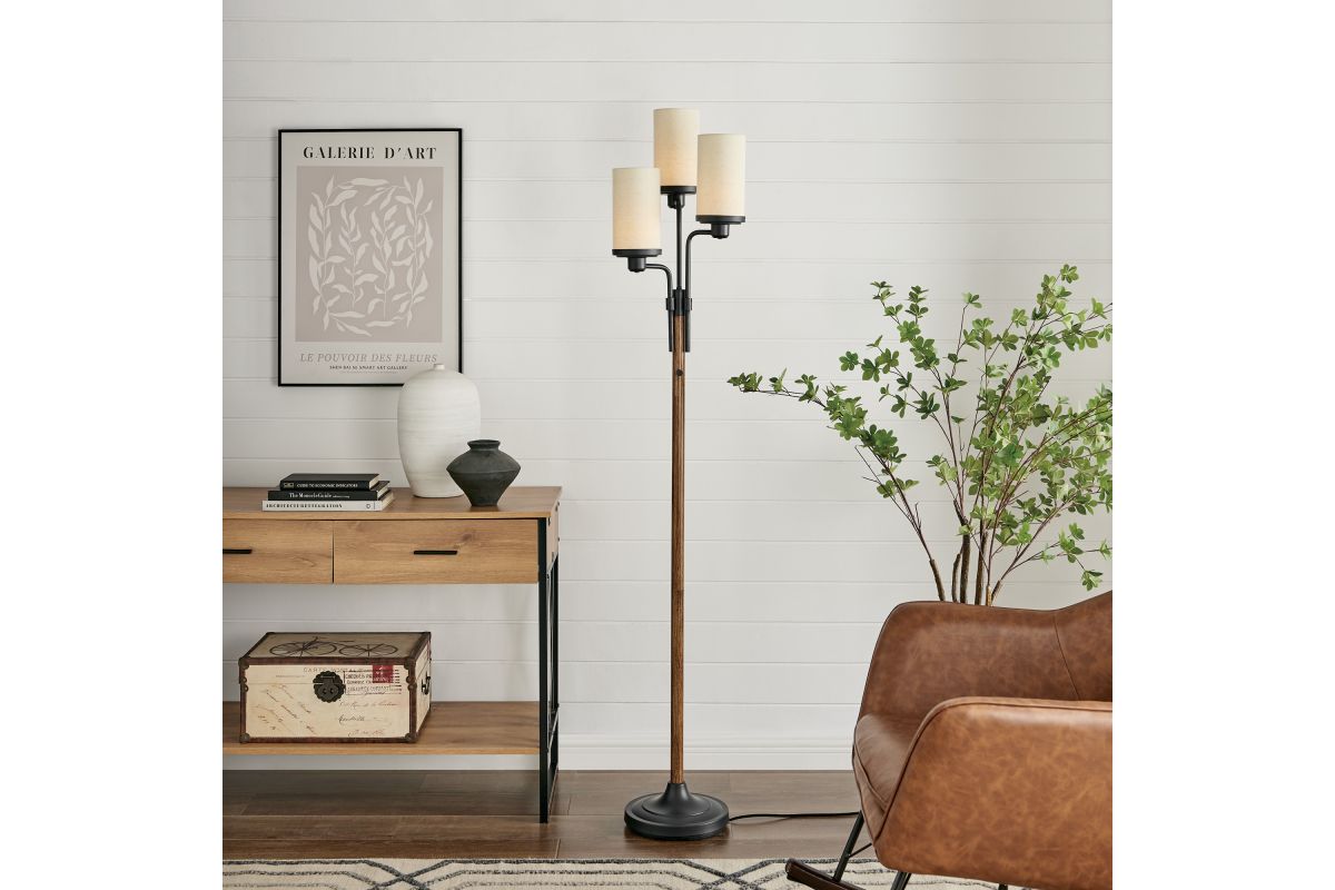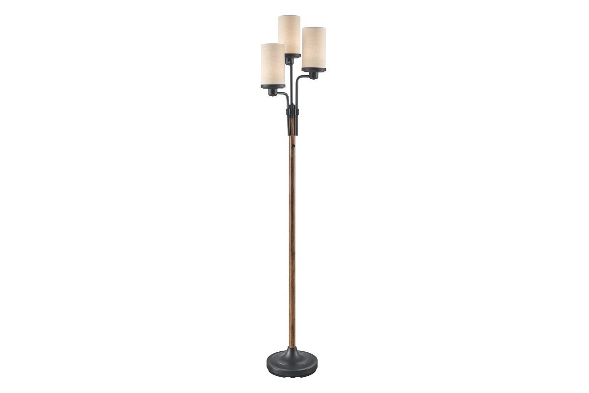 Discover our enchanting 3-light floor lamp, boasting a rustic faux wood and rich dark bronze finish crafted entirely from metal. This lamp is the perfect lighting solution for modern farmhouse, western, or lodge-style room decor. Topped with three oatmeal linen fabric drum shades, it emits a gentle and inviting glow, casting a warm ambiance throughout your space. With its versatile 3-level switch, you can illuminate the one light, two lights, or all three lights simultaneously, offering you flexibility and control over your lighting needs.