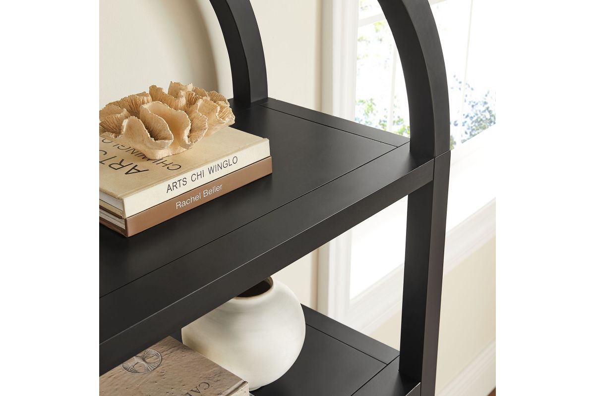 With its sculptural curves and modern take on classic arches, the Vexley Arched Bookshelf brings an artful edge to any space. Ideal for showcasing curated objects, favorite reads, or design-forward accents, this 60 inch open shelf bookcase plays with negative space and architectural curves, bringing an airy, artful touch to blank walls or creative corners. Built from a pine wood frame and shelves, Vexley offers both strength and style. For added safety, it includes an anti-tip bracket on one of the middle shelves and non-marking glides to protect flooring. A true conversation starter, this arch bookshelf adds sculptural depth without visual clutter, blending modern form with effortless display potential. Assembly required. Weight Capacity: 220lbs.