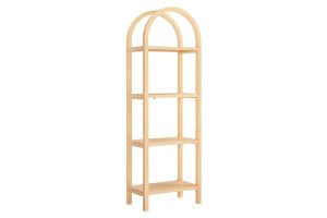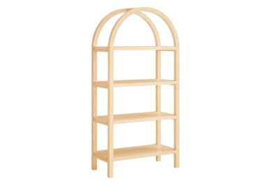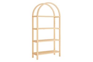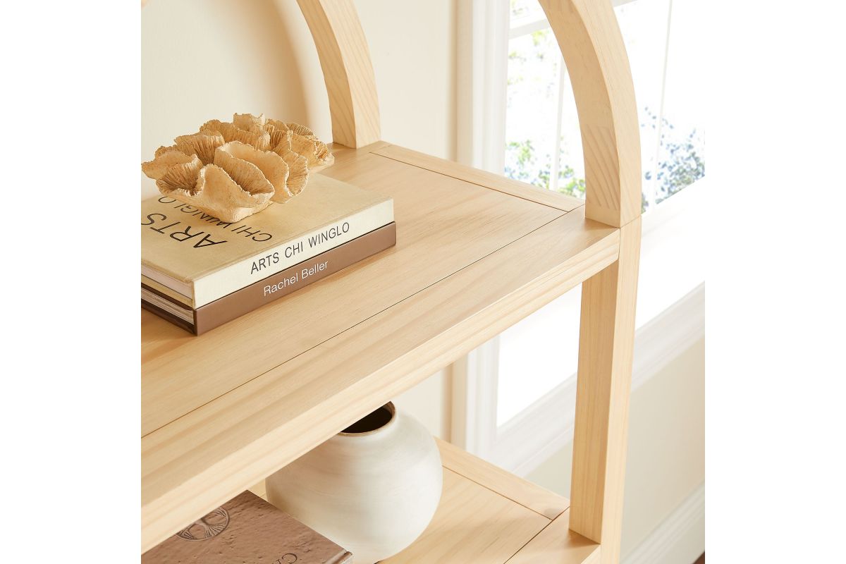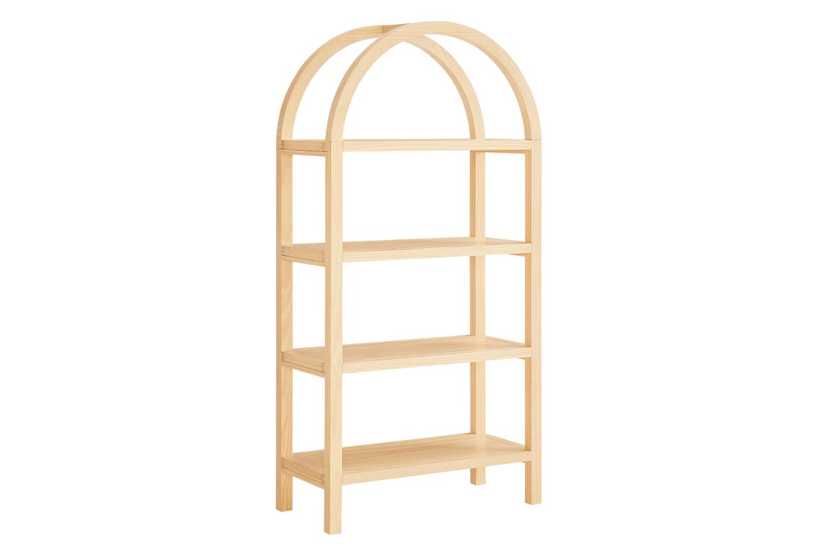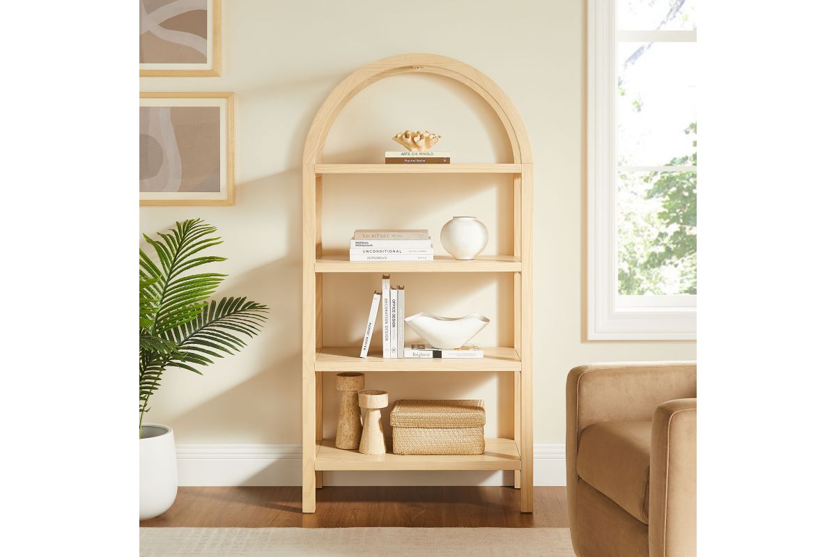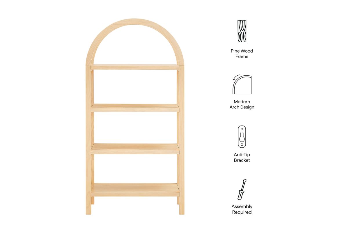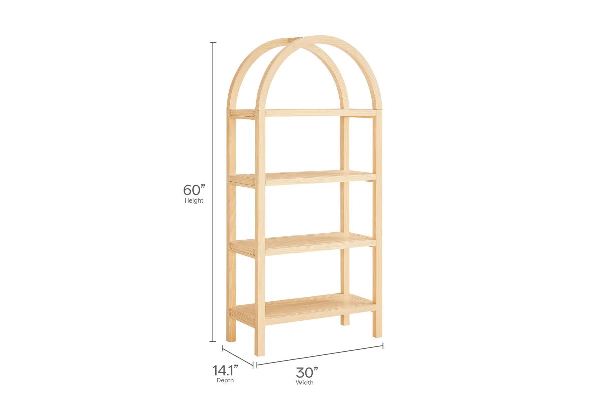 With its sculptural curves and modern take on classic arches, the Vexley Arched Bookshelf brings an artful edge to any space. Ideal for showcasing curated objects, favorite reads, or design-forward accents, this 60 inch open shelf bookcase plays with negative space and architectural curves, bringing an airy, artful touch to blank walls or creative corners. Built from a pine wood frame and shelves, Vexley offers both strength and style. For added safety, it includes an anti-tip bracket on one of the middle shelves and non-marking glides to protect flooring. A true conversation starter, this arch bookshelf adds sculptural depth without visual clutter, blending modern form with effortless display potential. Assembly required. Weight Capacity: 220lbs.