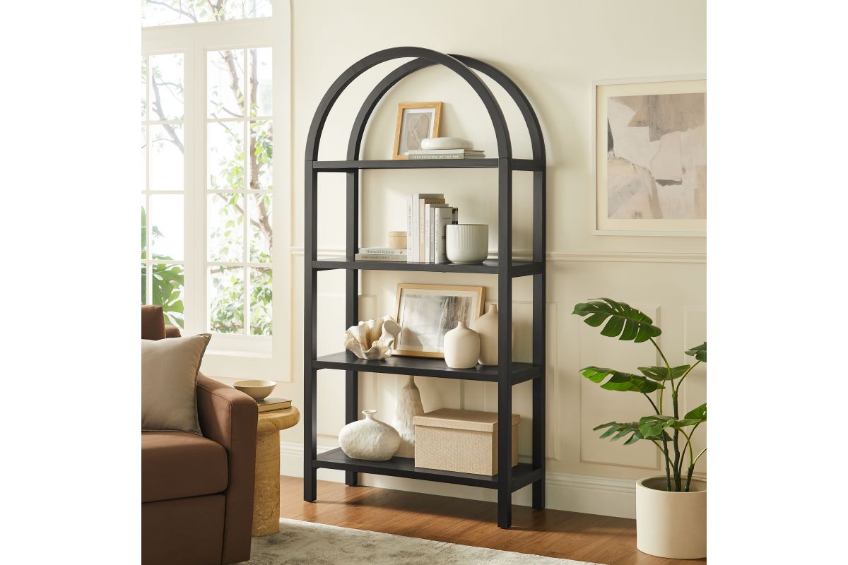 With its sculptural curves and modern take on classic arches, the Vexley Arched Bookshelf brings an artful edge to any space. Ideal for showcasing curated objects, favorite reads, or design-forward accents, this large 72 inch open shelf bookcase plays with negative space and architectural curves, bringing an airy, artful touch to blank walls or creative corners. Built from a pine wood frame and shelves, Vexley offers both strength and style. For added safety, it includes an anti-tip bracket on one of the middle shelves and non-marking glides to protect flooring. A true conversation starter, this arch bookshelf makes a bold statement without visual clutter, blending modern form with effortless display potential. Assembly required. Weight Capacity: 220lbs.